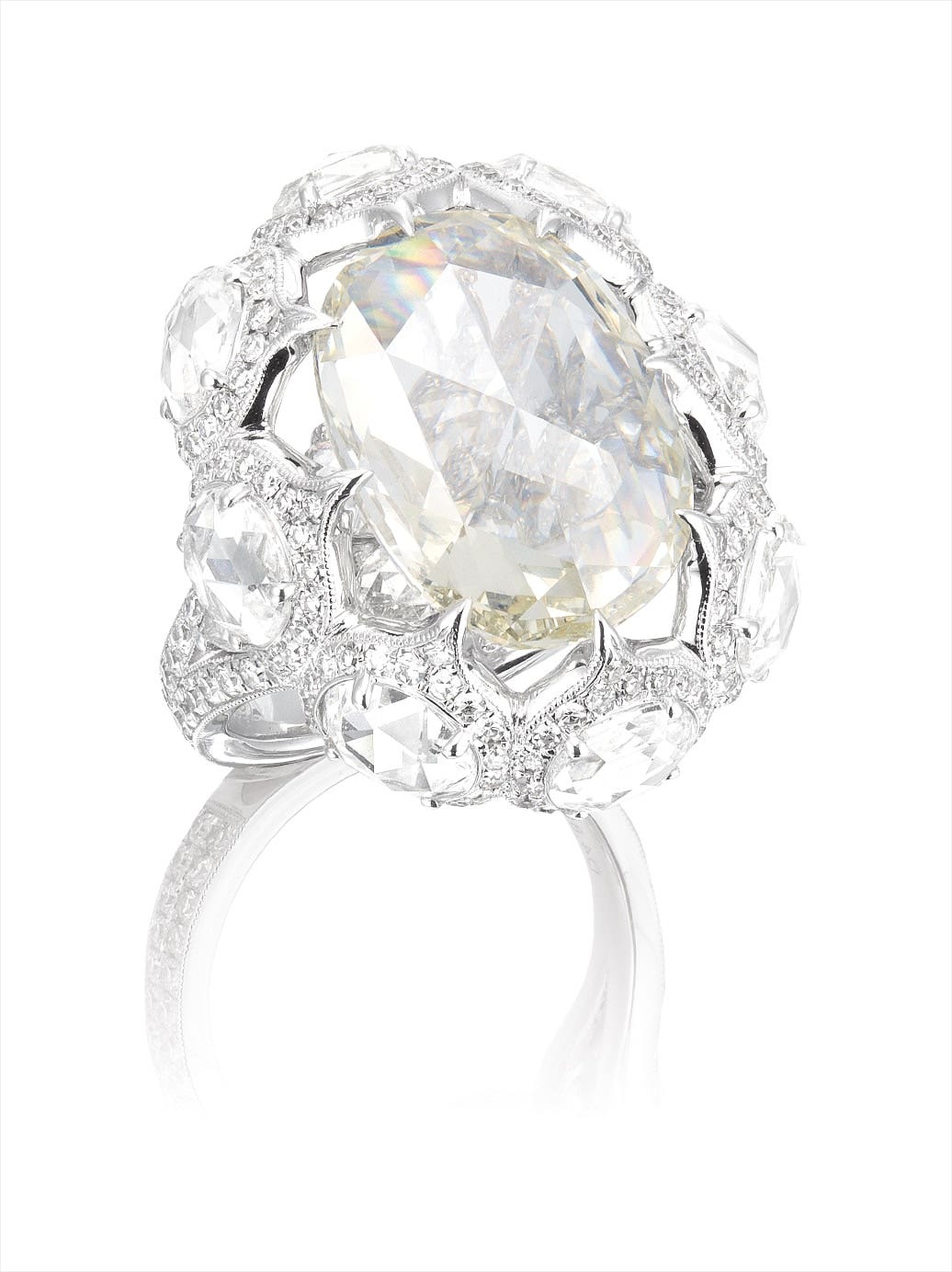 One oval modified brilliant-cut diamond, 7.06 caratsRose- and brilliant-cut diamonds in the surround and basket, together approximately 6.10 carats18 karat white gold(7.06-carat Diamond)