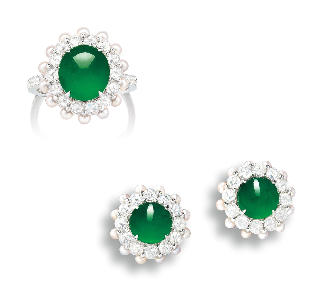 A Jadeite, Seed Pearl and Diamond Ring, and a Pair of Matching Earrings