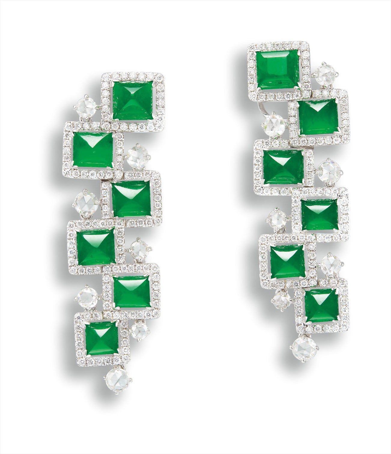 Twelve sugarloaf jadeites, <em>measuring approximately 5.35 x 5.45 x 5.08mm to 4.50 x 4.47 x 3.00mm</em>Brilliant- and rose-cut diamonds in the surrounds, together approximately 2.25 carats18 karat white gold(Sugarloaf Jadeites)