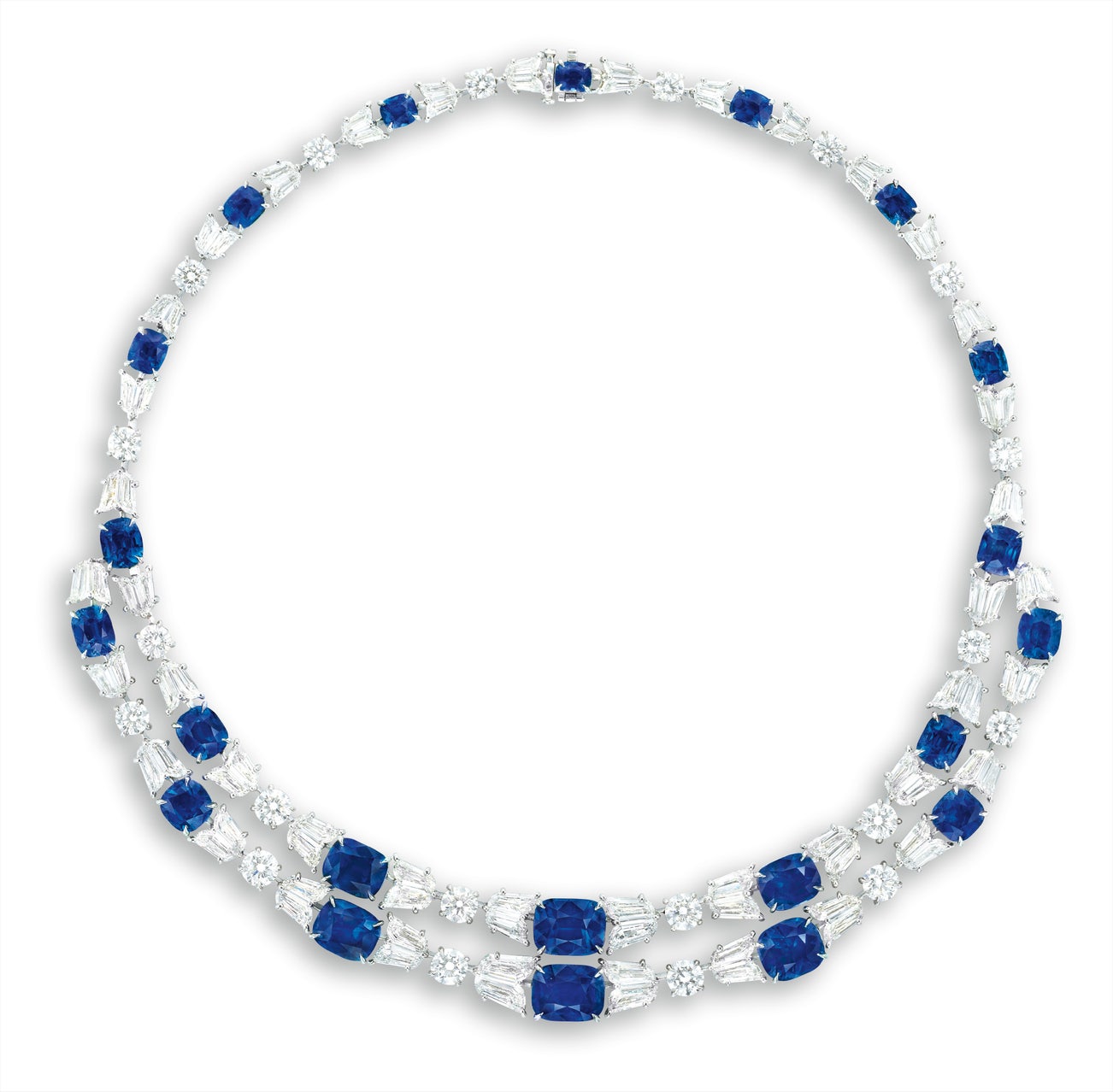 Twenty-one cushion-shaped sapphires, totalling 52.50 caratsSpaced by brilliant-cut and fancy-shaped diamonds, totalling approximately 35.25 caratsPlatinum(Twenty-one Sapphires)