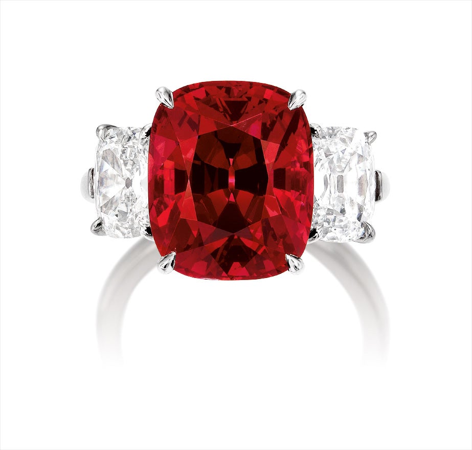 One cushion-shaped red spinel, 8.73 caratsTwo cushion-shaped diamonds on side, each 0.90 caratPlatinum(8.73-carat Red Spinel)
