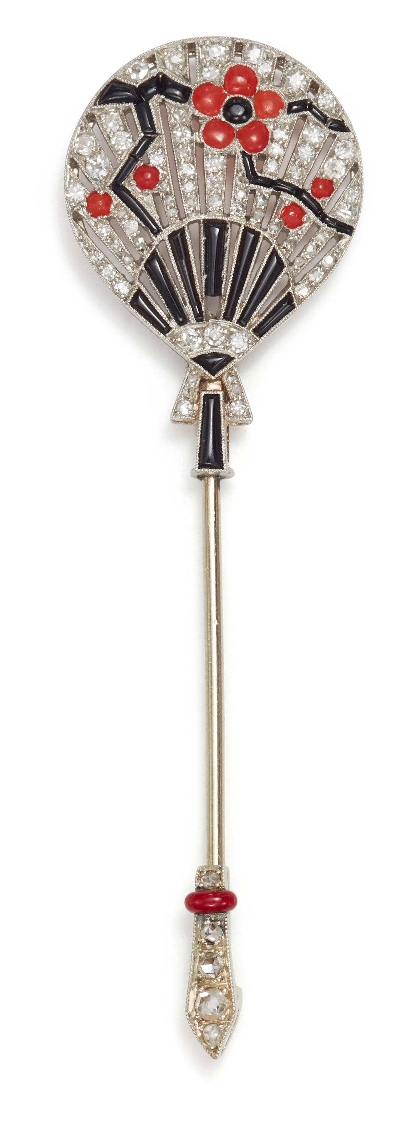 An Art Deco Diamond, Onyx, and Coral Jabot Pin