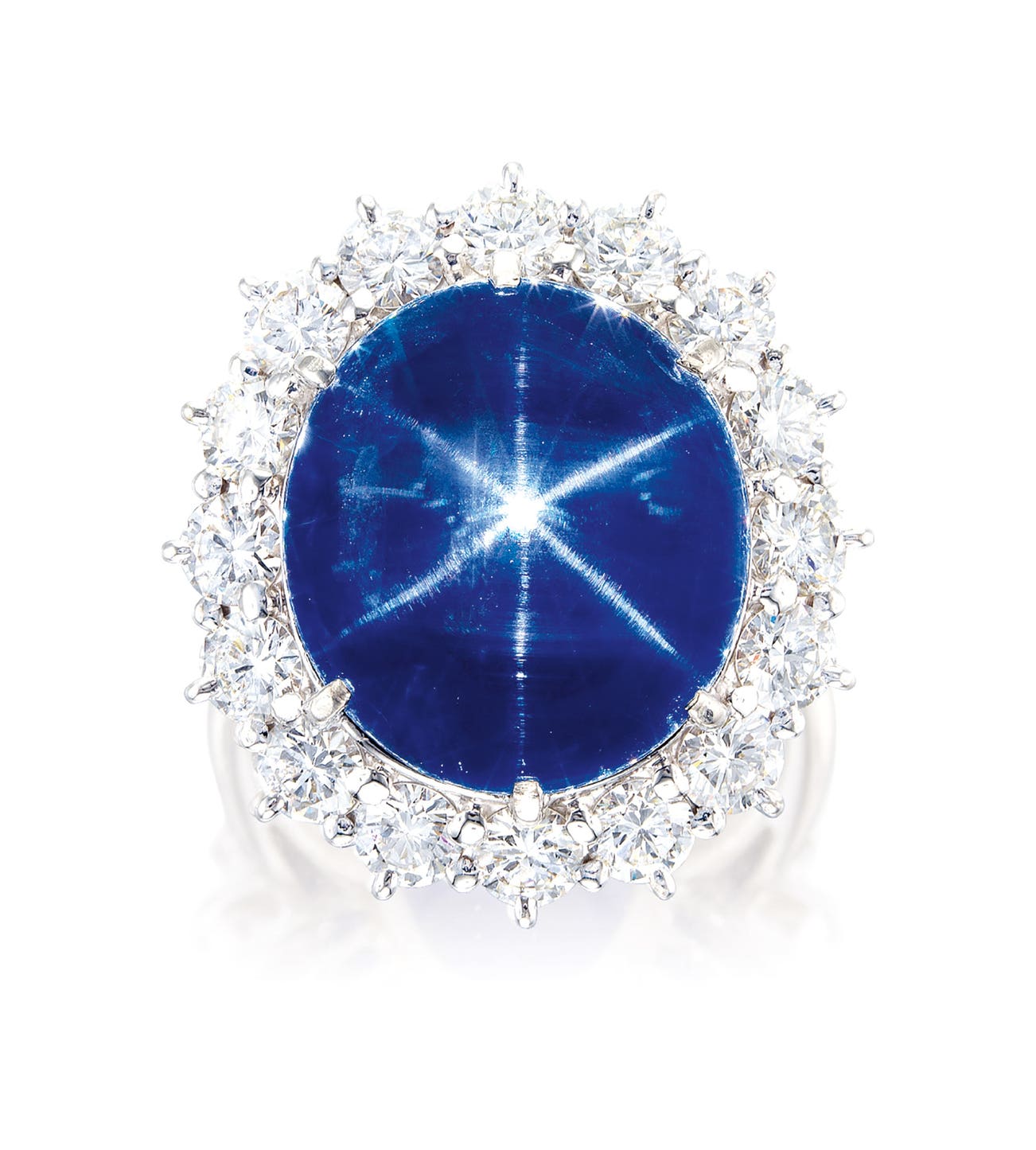 One cabochon star sapphire, 22.00 caratsSixteen brilliant-cut diamonds in the surround, totalling approximately 2.40 caratsPlatinum(22.00-carat Star Sapphire)