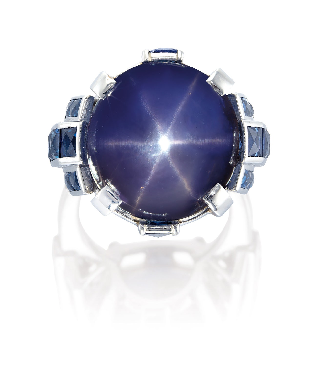 One cabochon star sapphire, approximately 30.00 caratsDecorated by calibré-cut sapphiresPlatinum(Star Sapphire)