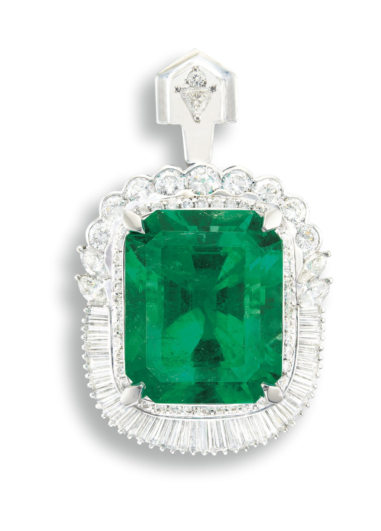 One step-cut emerald, 26.13 caratsBrilliant-cut, marquise and tapered baguette diamonds in the surround, totalling approximately 3.65 caratsPlatinum(26.13-carat Emerald)