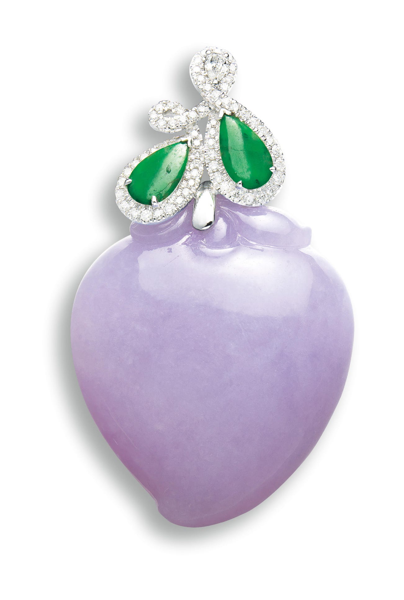 One carved lavender jadeite 'peach', <em>measuring approximately 40.96 x 35.13 x 13.19mm</em>Two pear-shaped jadeite plaques in the surmount, with diamond surround18 karat white gold(Lavender Jadeite)