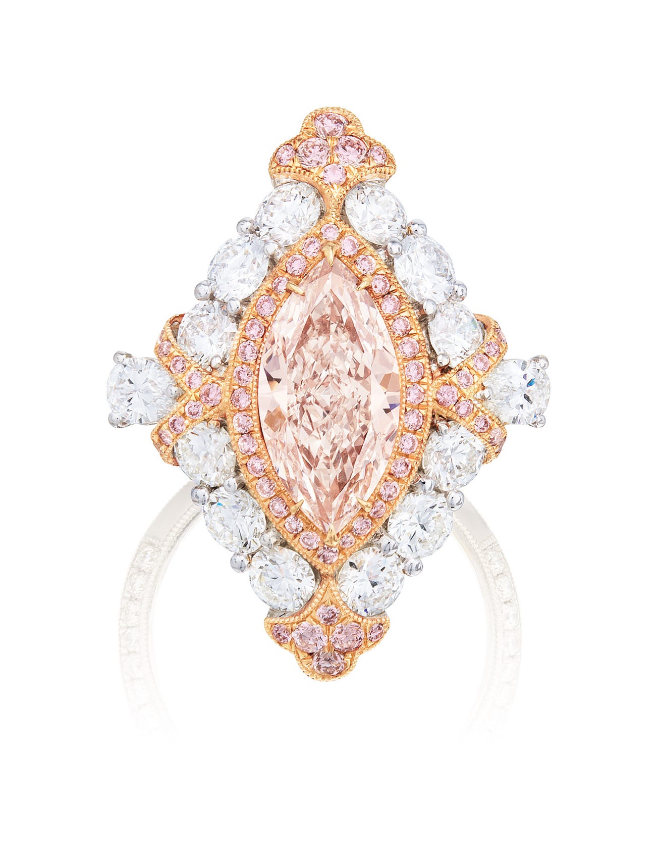 One marquise-shaped Light Pink-Brown Diamond, 2.06 caratsSmaller pink diamonds and brilliant-cut diamonds together weighing approximately 3.30 carats18 karat white and pink gold(2.06-carat Diamond)