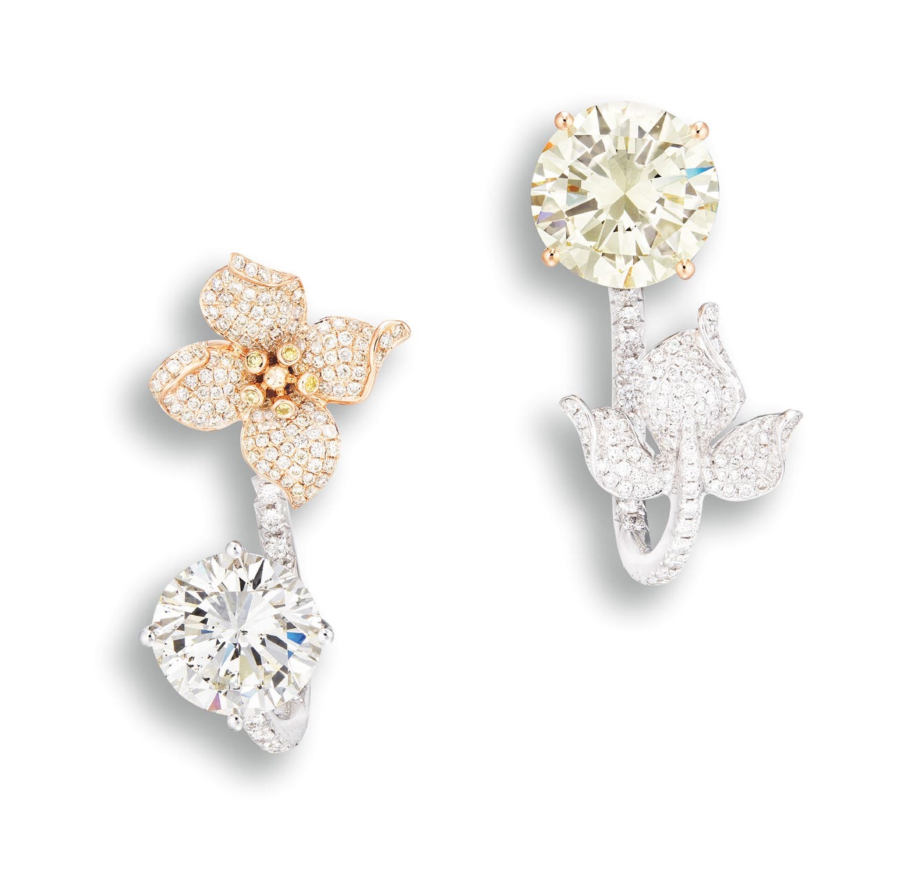 Two brilliant-cut diamonds, 4.04 and 3.17 caratsOf mismatch design, embellished by smaller diamonds18 karat white and pink gold(4.04-carat Diamond)<em> GIA report, numbered 2286275493, dated 23 February 2018, O to P range colour, SI1 clarity.</em>