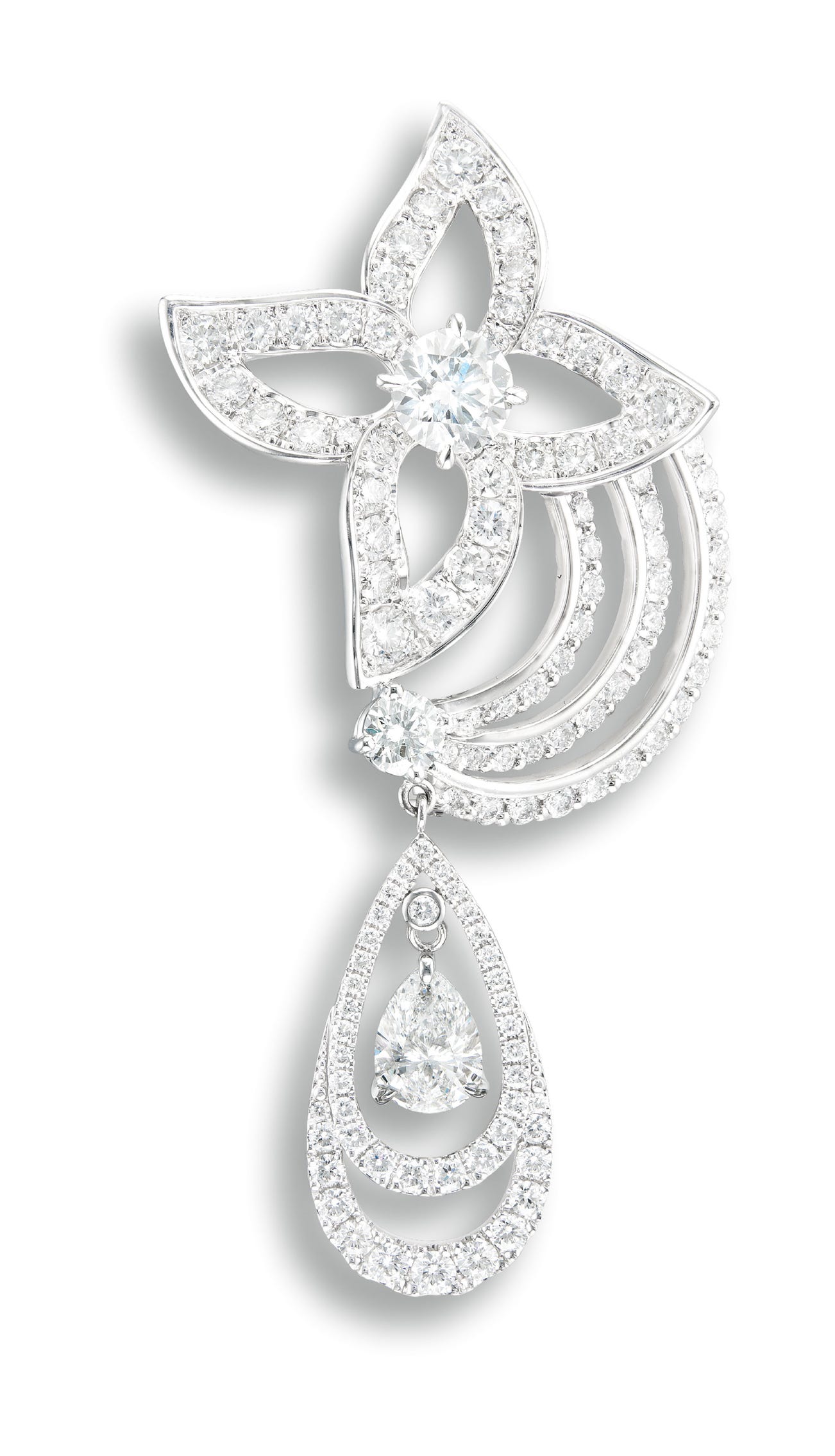 One brilliant-cut diamond set in the middle, 1.06 caratsOne suspended pear-shaped diamond, 1.09 caratsOther brilliant-cut diamonds in the surrounds totalling approximately 3.00 caratsPlatinum(1.09- and 1.06-carat Diamonds)