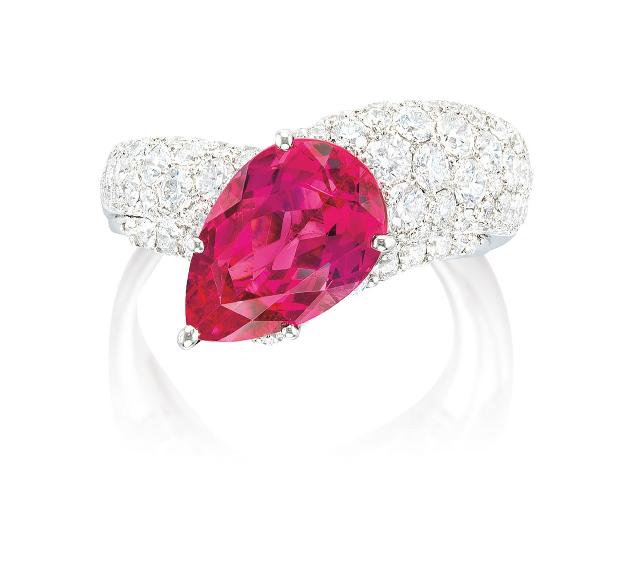 One pear-shaped red spinel, 3.85 caratsBrilliant-cut diamonds, totalling approximately 1.80 caratsPlatinum(3.85-carat Spinel)