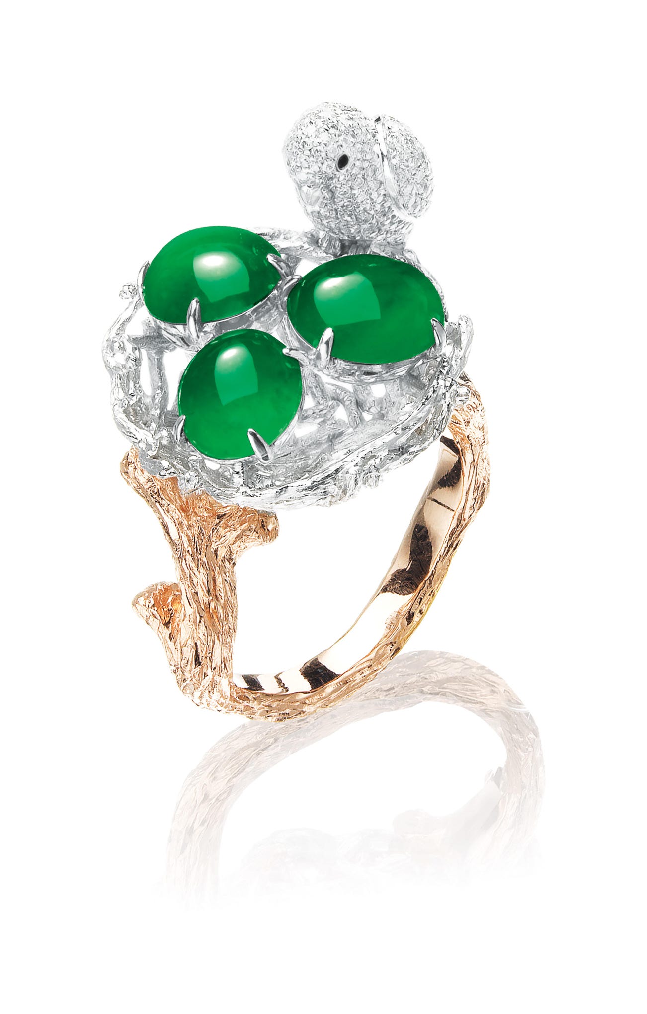 A Whimsical Jadeite Cabochon and Diamond 'Bird Nest' Ring