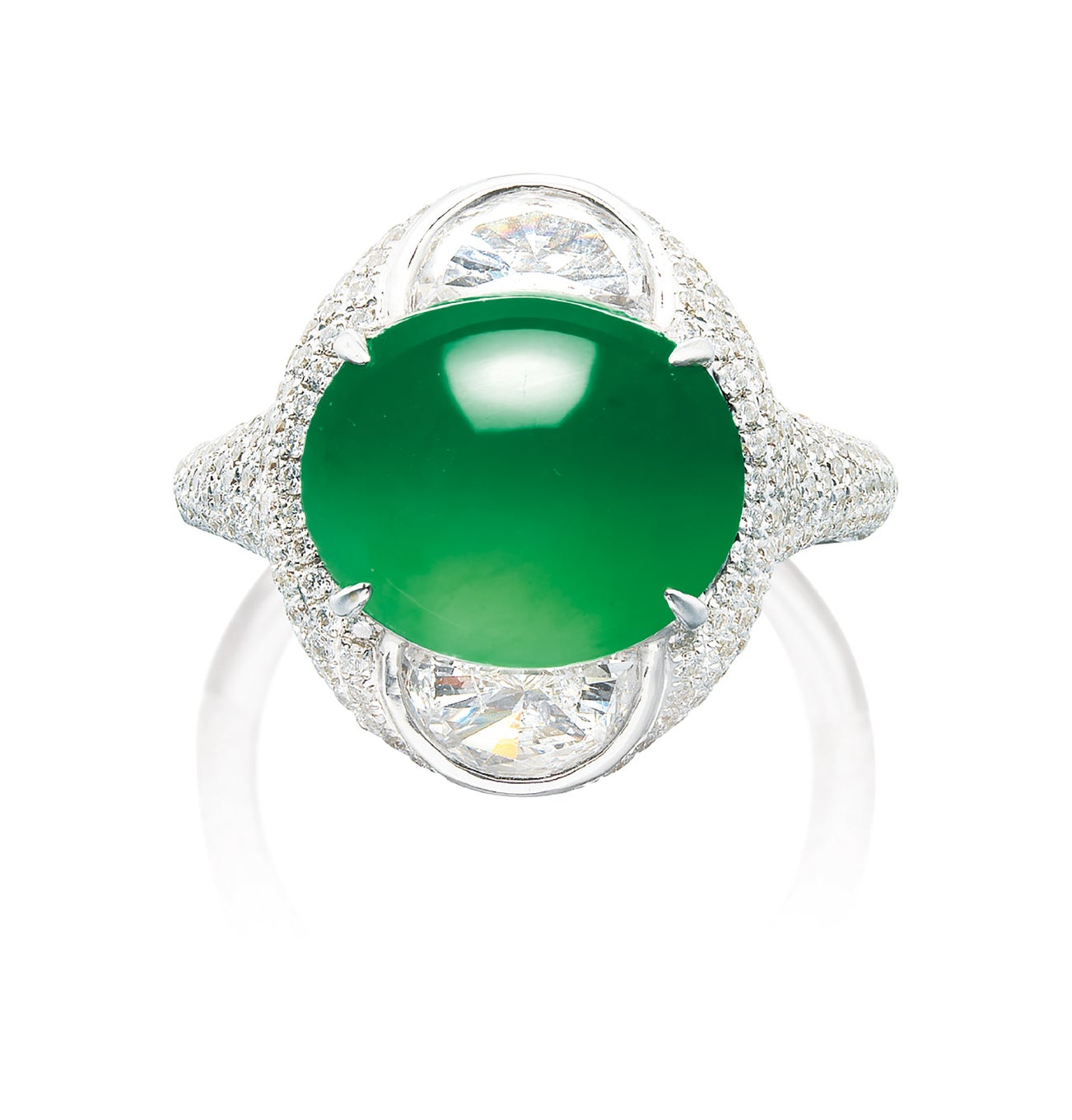One oval jadeite cabochon, <em>measuring approximately 12.92 x 11.03 x 6.43mm</em>Brilliant-cut diamond in gallery and shank, highlighted by two half-moon shaped diamonds, totalling approximately 2.65 carats18 karat white gold(Jadeite cabochon)
