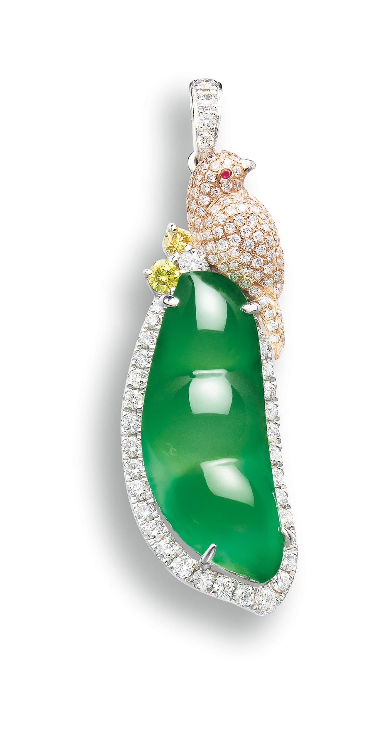 One jadeite peapod, <em>measuring approximately 23.16 x 9.34 x 6.70mm</em>Numerous diamonds and two yellow diamonds together approximately 1.15 carats18 karat white and rose gold(Jadeite 'Peapod')