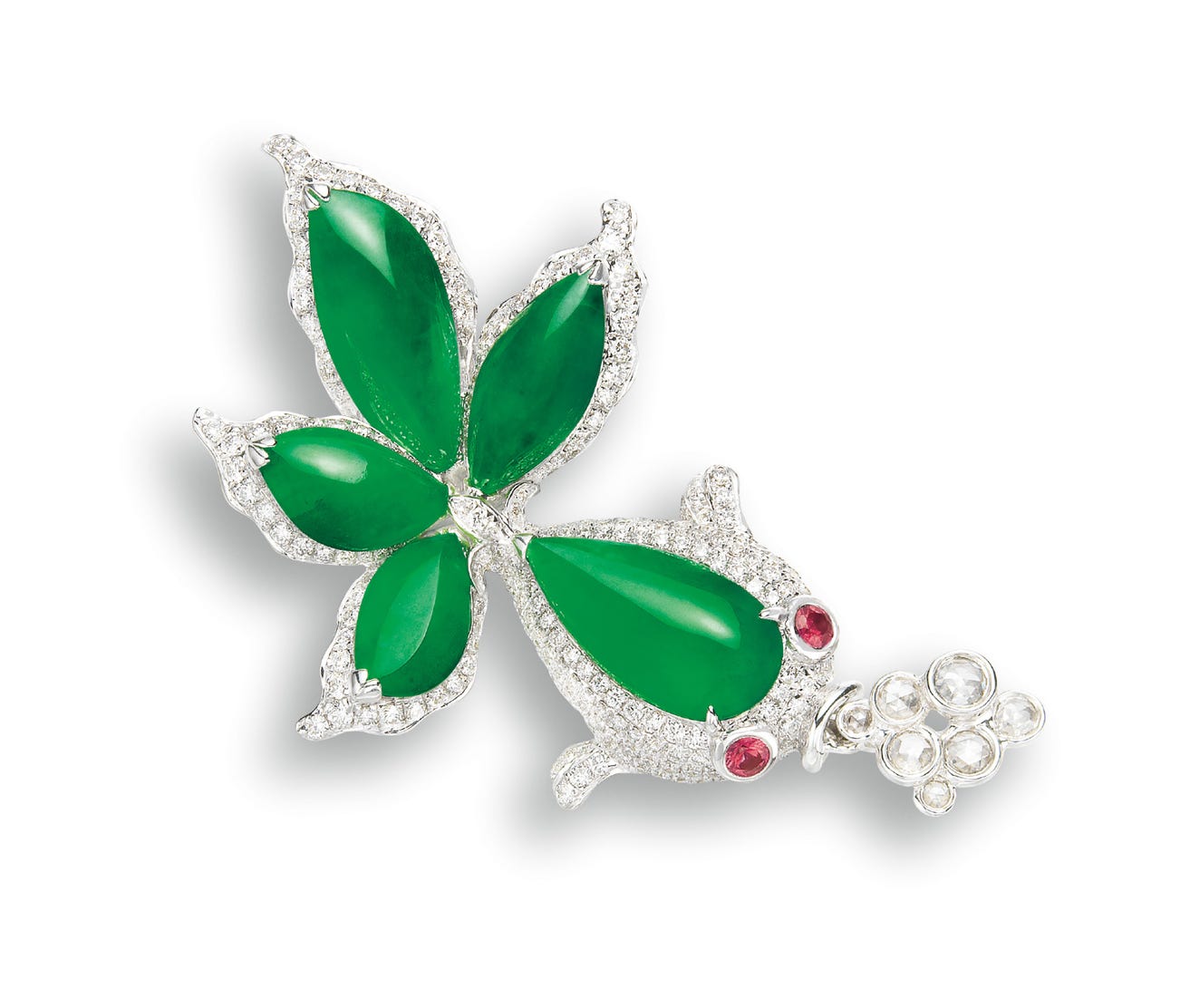 Five jadeite cabochons set as the body and fish tail, <em>measuring approximately 13.77 x 7.12 x 2.88mm to 8.81 x 5.48 x 2.80mm</em>Surrounded by brilliant-cut diamonds, with rose-cut diamond 'bubbles', together approximately 1.40 caratsRuby-set eyes18 karat white gold(Five Jadeite cabochons)