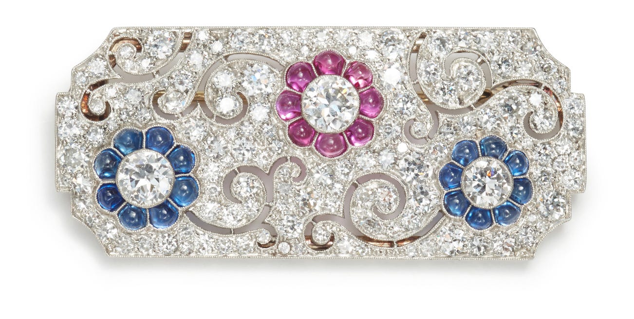 An Art Deco Diamond, Ruby and Sapphire Brooch