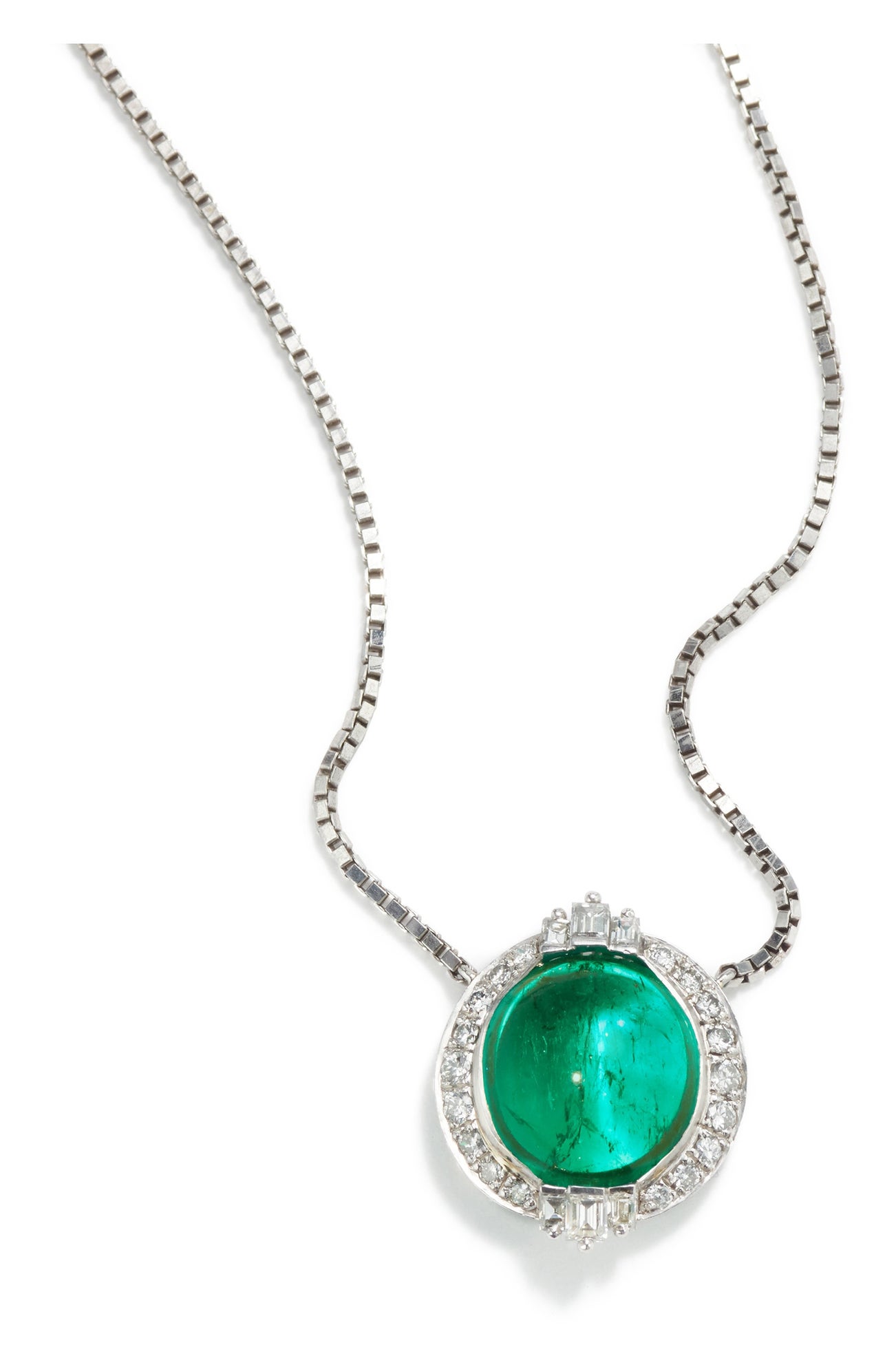 An oval-shaped emerald cabochon, approximately 5.00 carats