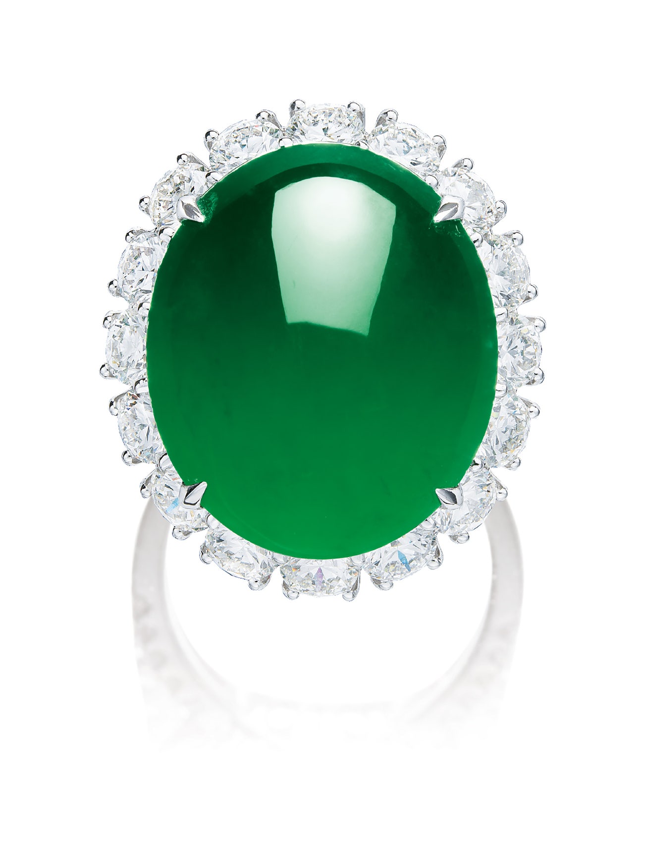 One oval jadeite cabochon, <em>measuring approximately 20.71 x 17.48 x 9.08mm </em>Brilliant-cut diamonds in the surround and on shank, totalling approximately 4.15 carats18 karat white gold(Jadeite cabochon)
