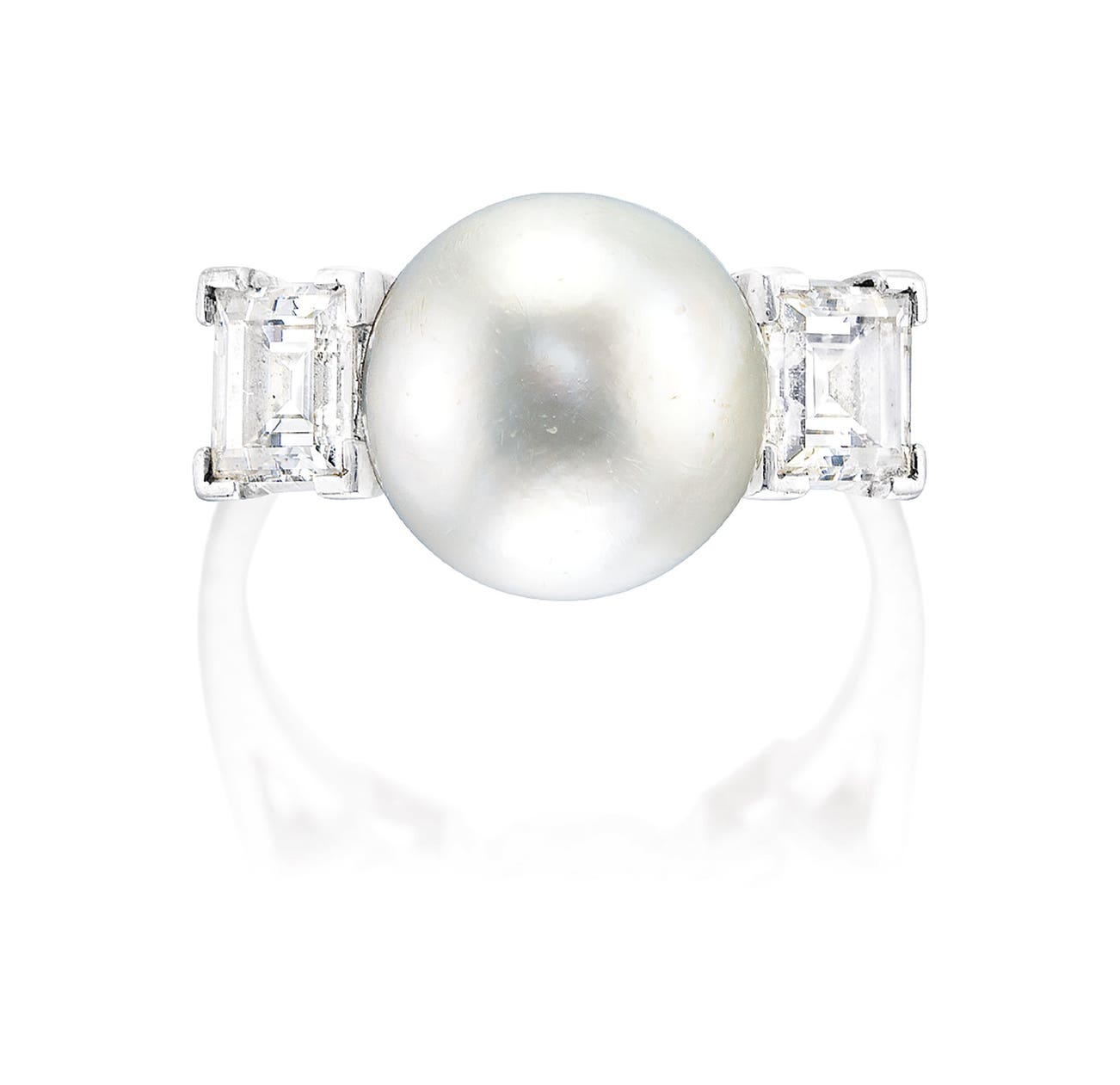 A white button-shaped natural saltwater pearl, <em>diameter approximately 10.65mm</em>Flanked by two step-cut diamonds, together approximately 1.00 caratPlatinum(Pearl)