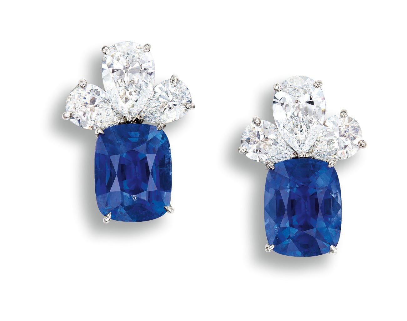 Two cushion-shaped sapphires, 8.35 and 8.12 caratsEach set with three pear-shaped diamonds in the surmount, altogether approximately 6.40 caratsPlatinum(8.35- and 8.12-carat Sapphires)