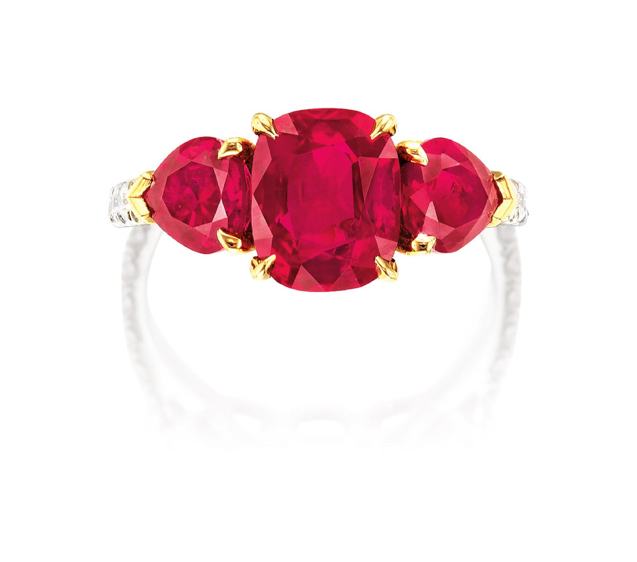 Centring on a cushion-shaped ruby, 2.25 caratsFlanked by two pear-shaped rubies, together approximately 1.95 caratsBrilliant-cut diamonds on shankPlatinum and 18 karat yellow gold(2.25-carat Ruby)