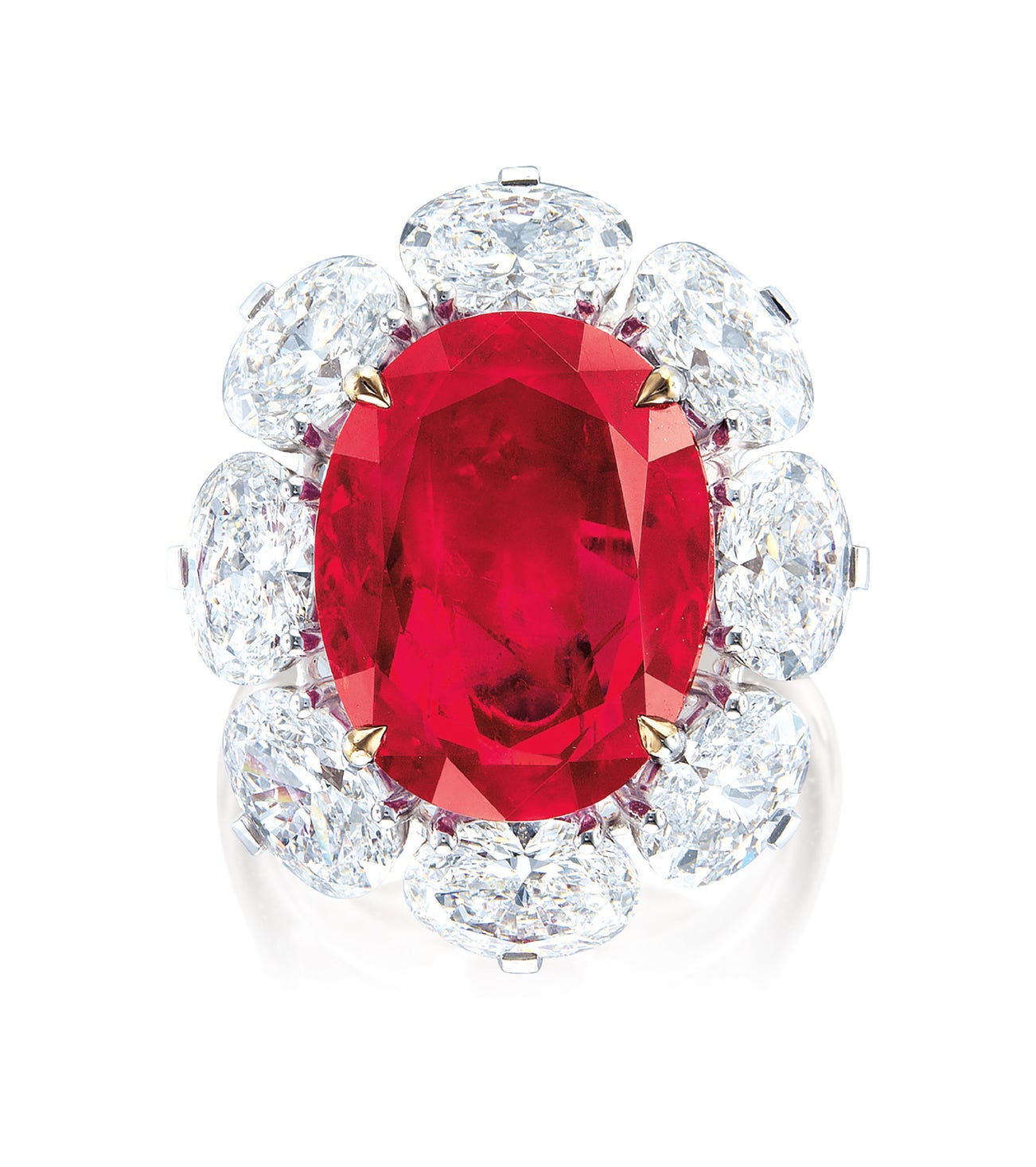 One oval ruby, 10.02 caratsSurrounded by eight oval diamonds, together weighing 5.27 carats18 karat white gold(10.02-carat Ruby)