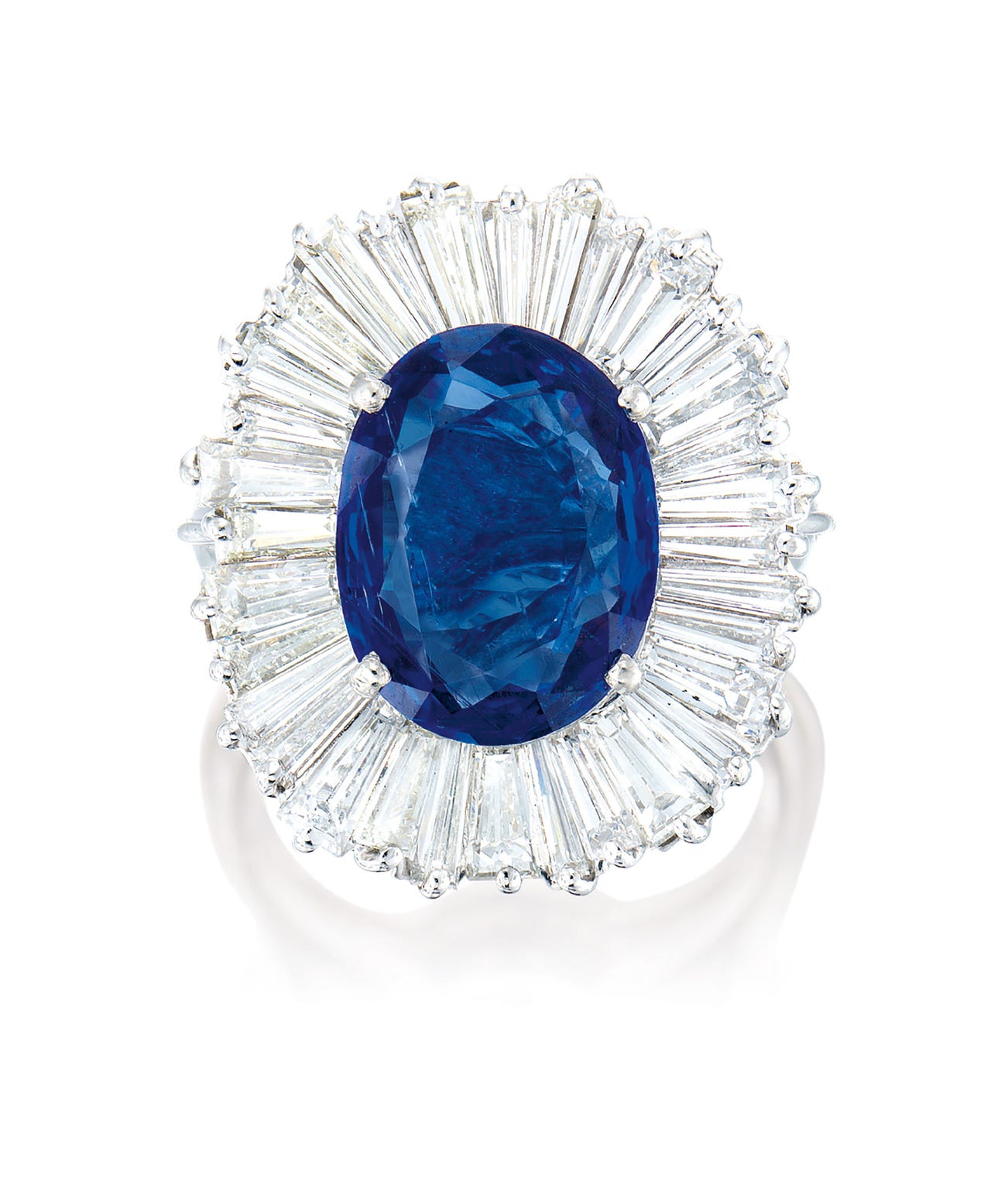 One oval sapphire, 4.82 caratsTapered baguette diamonds in the surround, totalling approximately 1.50 caratsPlatinum(4.82-carat Sapphire)