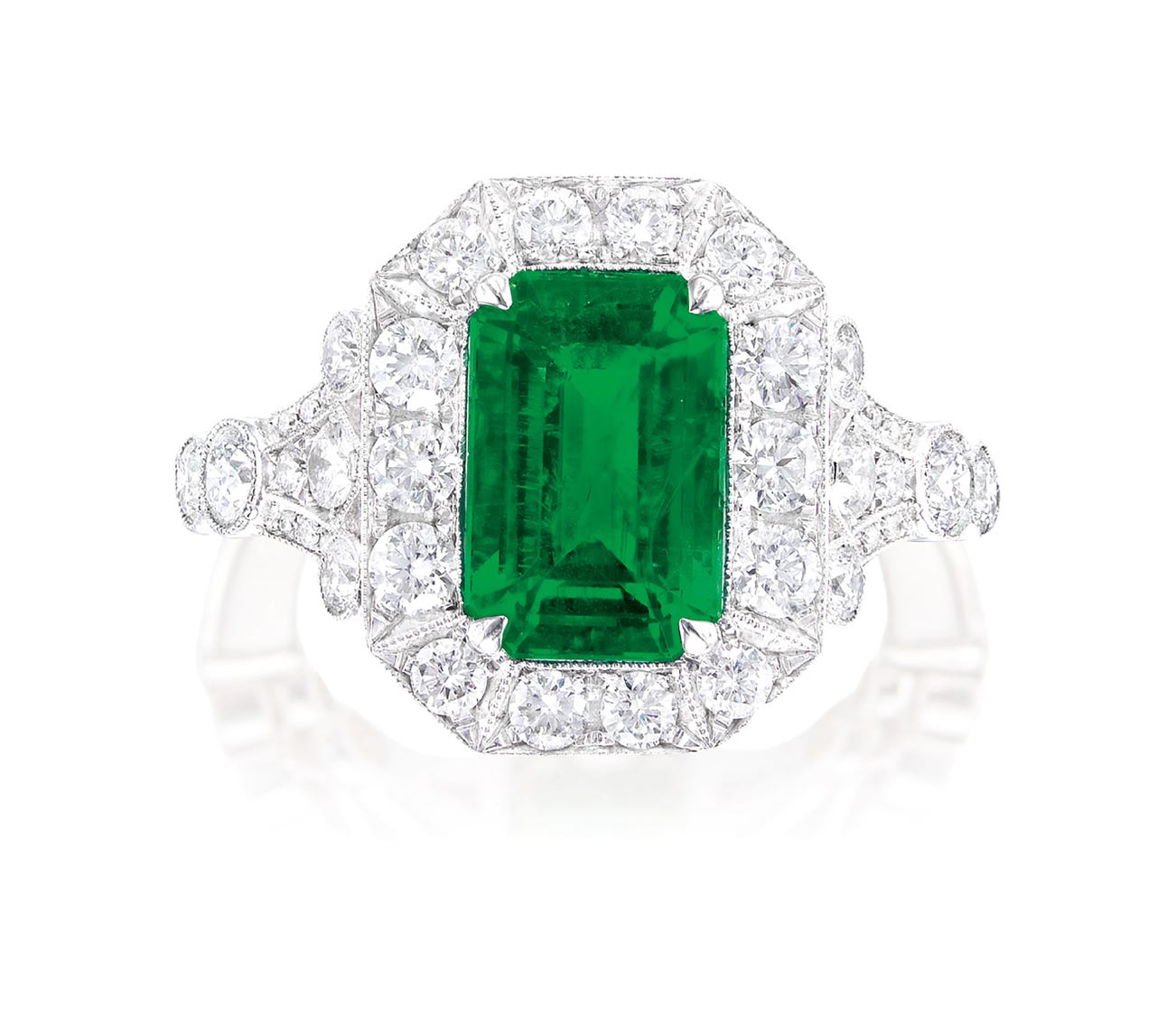 A step-cut emerald, 3.86 caratsBrilliant-cut diamonds in the surround and shoulders, totalling 1.50 caratsPlatinum(3.86-carat Emerald)