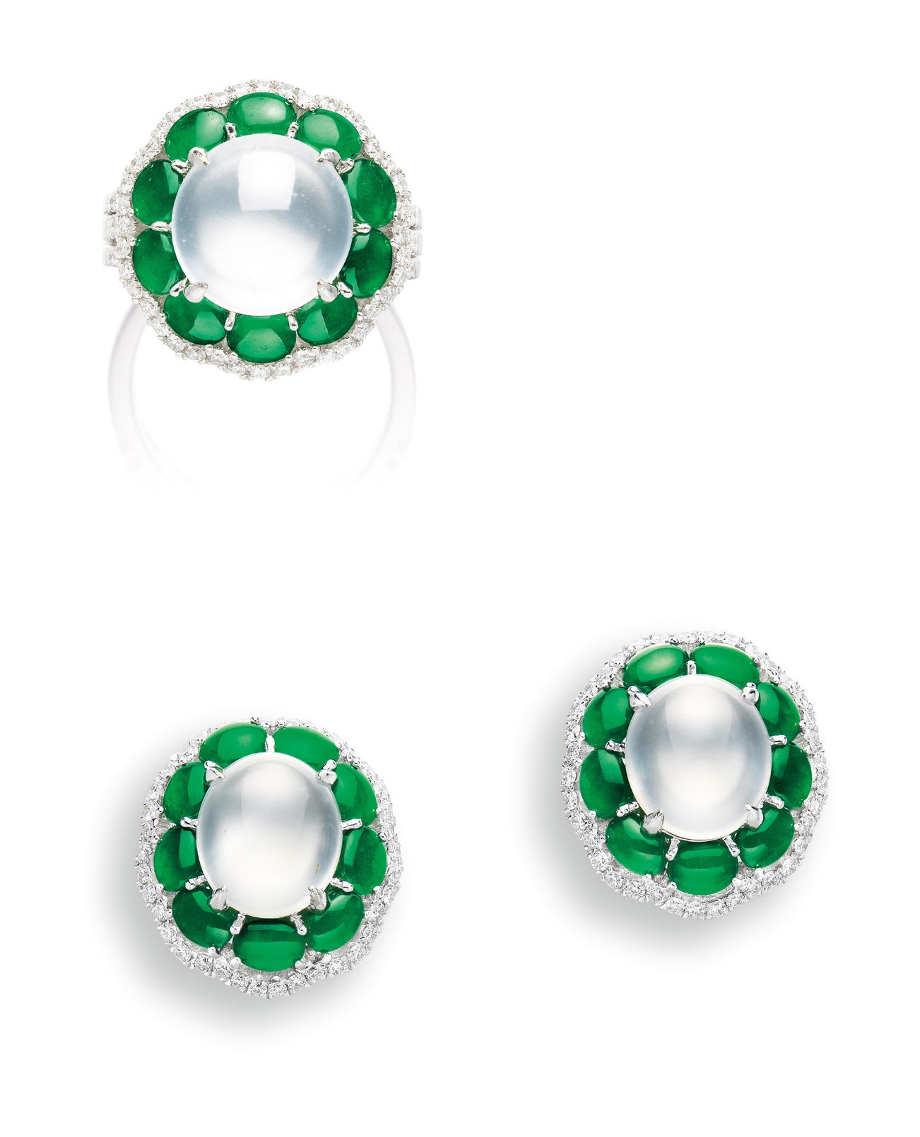 An Icy Jadeite Cabochon, Jadeite and Diamond Ring, and a Pair of Matching Earrings