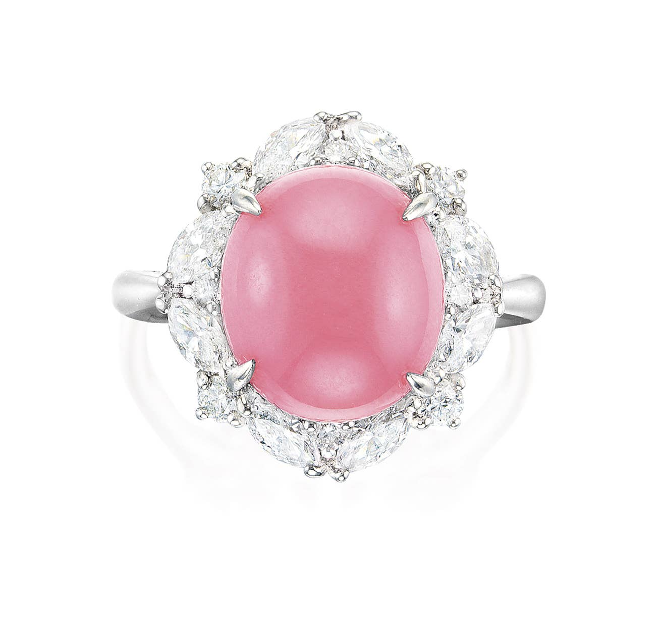 One ovoid pink conch pearl, approximately 8.36 caratsSurrounding diamonds totalling approximately 1.05 caratsPlatinum(Conch Pearl)