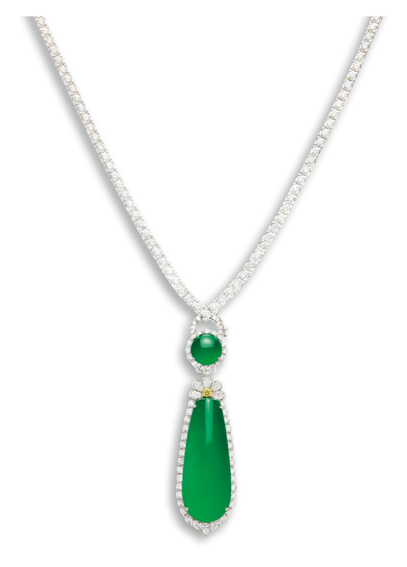 Brilliant-cut and pear-shaped diamonds in the surround and necklace, totalling approximately 16.00 carats18 karat white and yellow gold(Jadeite cabochons)