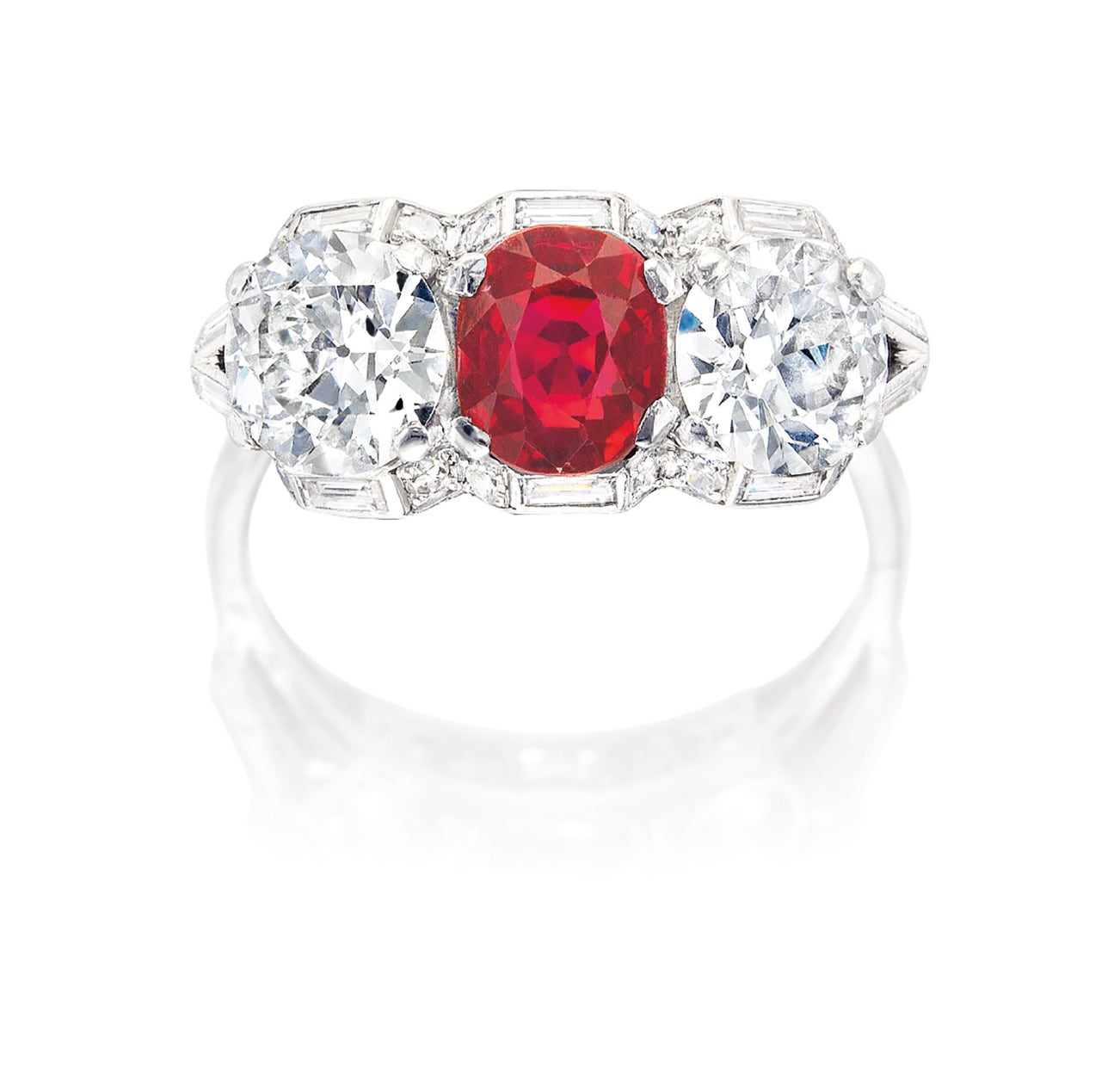 An oval ruby, 1.44 caratsFlanked by two brilliant-cut diamonds, together approximately 2.00 caratsTiny baguette and circular-cut diamonds on sidePlatinum(1.44-carat Ruby)