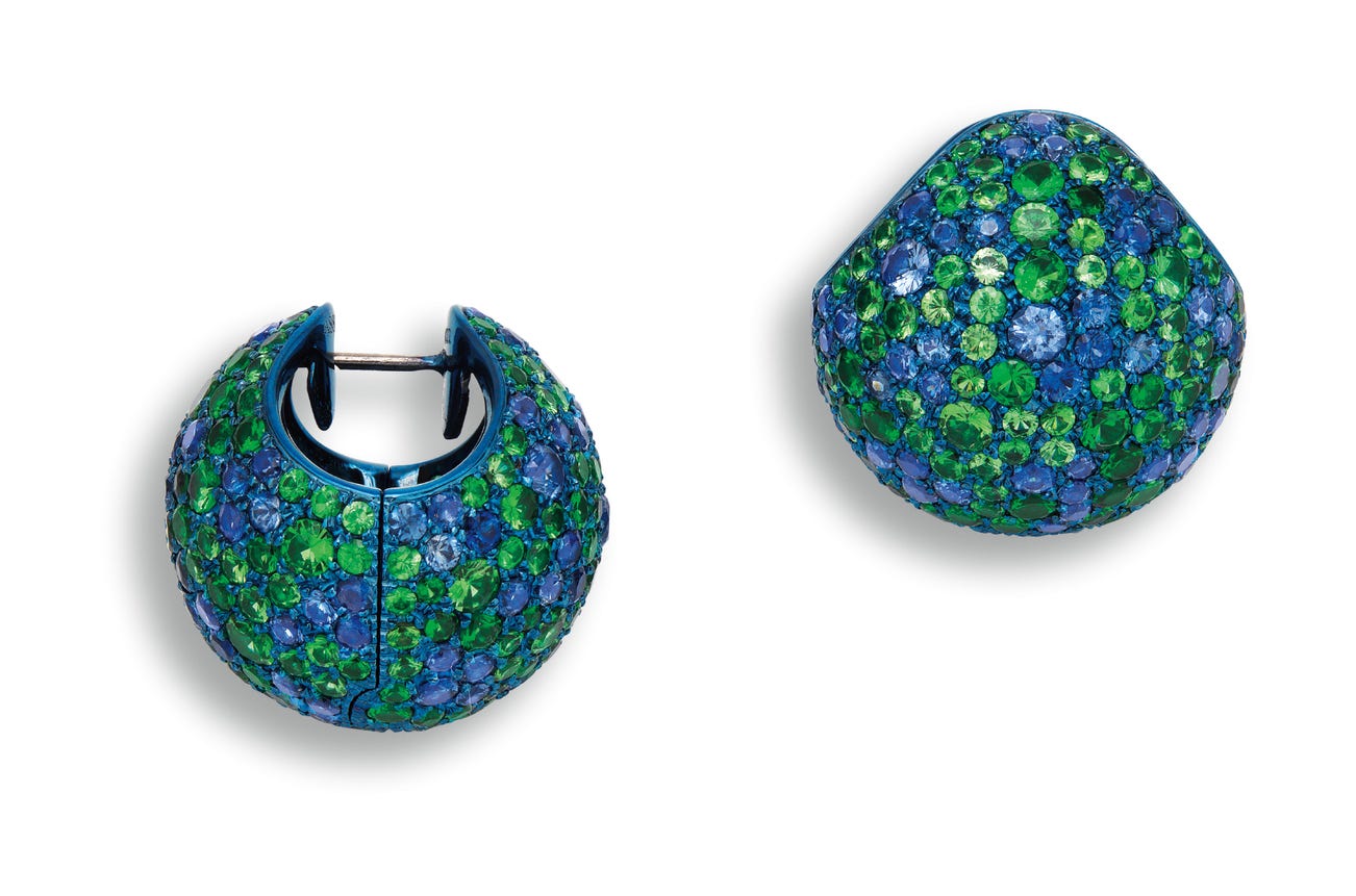 Designed as a hinged sphere, pavé-set with circular-cut sapphires and tsavorite garnets totalling approximately 7.70 and 11.55 carats respectivelyTitanium