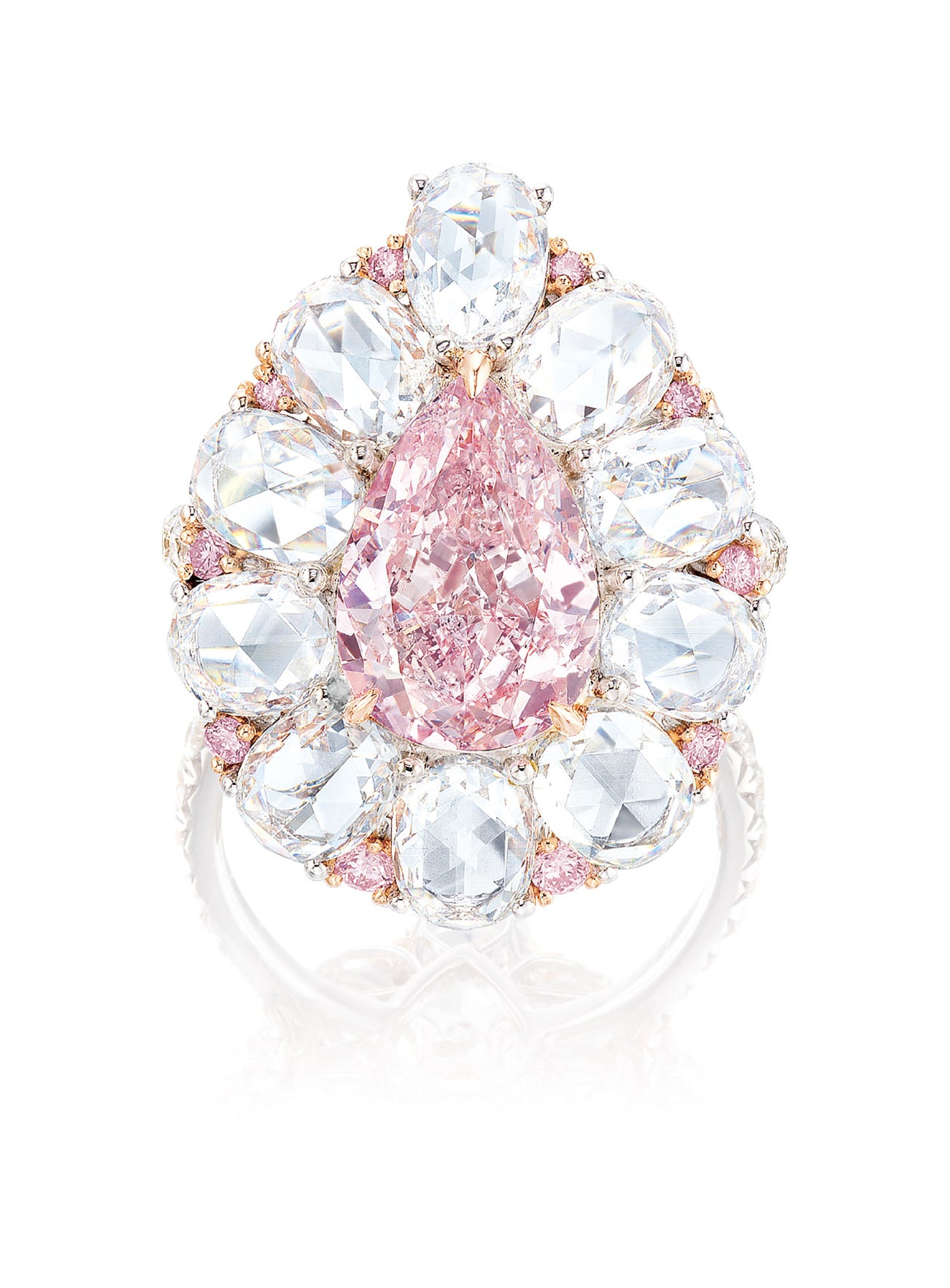 One pear-shaped Fancy Purplish Pink diamond, 3.81 caratsSurrounded by rose-cut diamonds and pink diamonds, totalling approximately 5.20 carats18 karat white and pink gold(3.81-carat Pink Diamond)