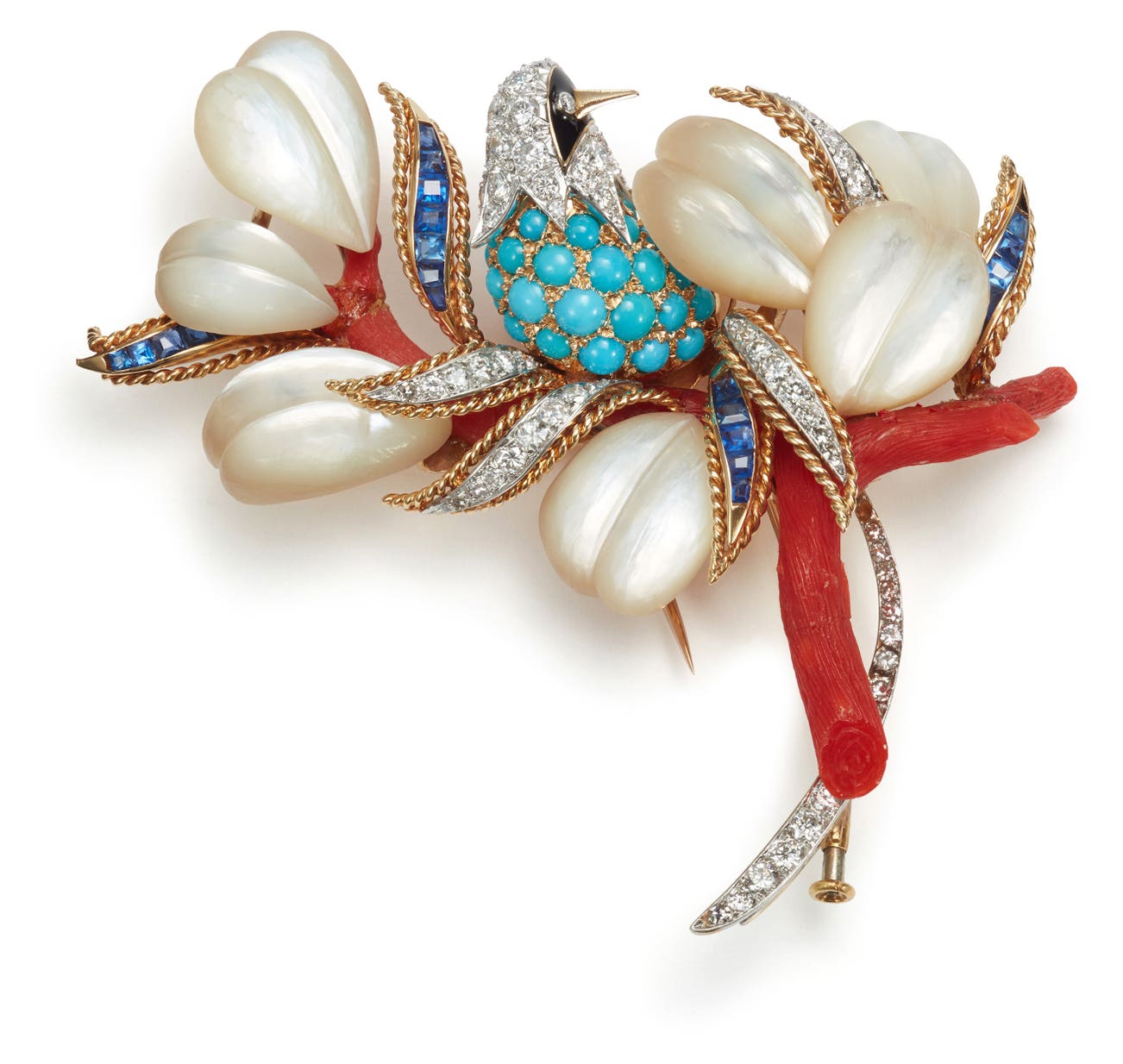 A Diamond, Sapphire, Turquoise, Mother-of-Pearl, Coral, and Onyx Brooch