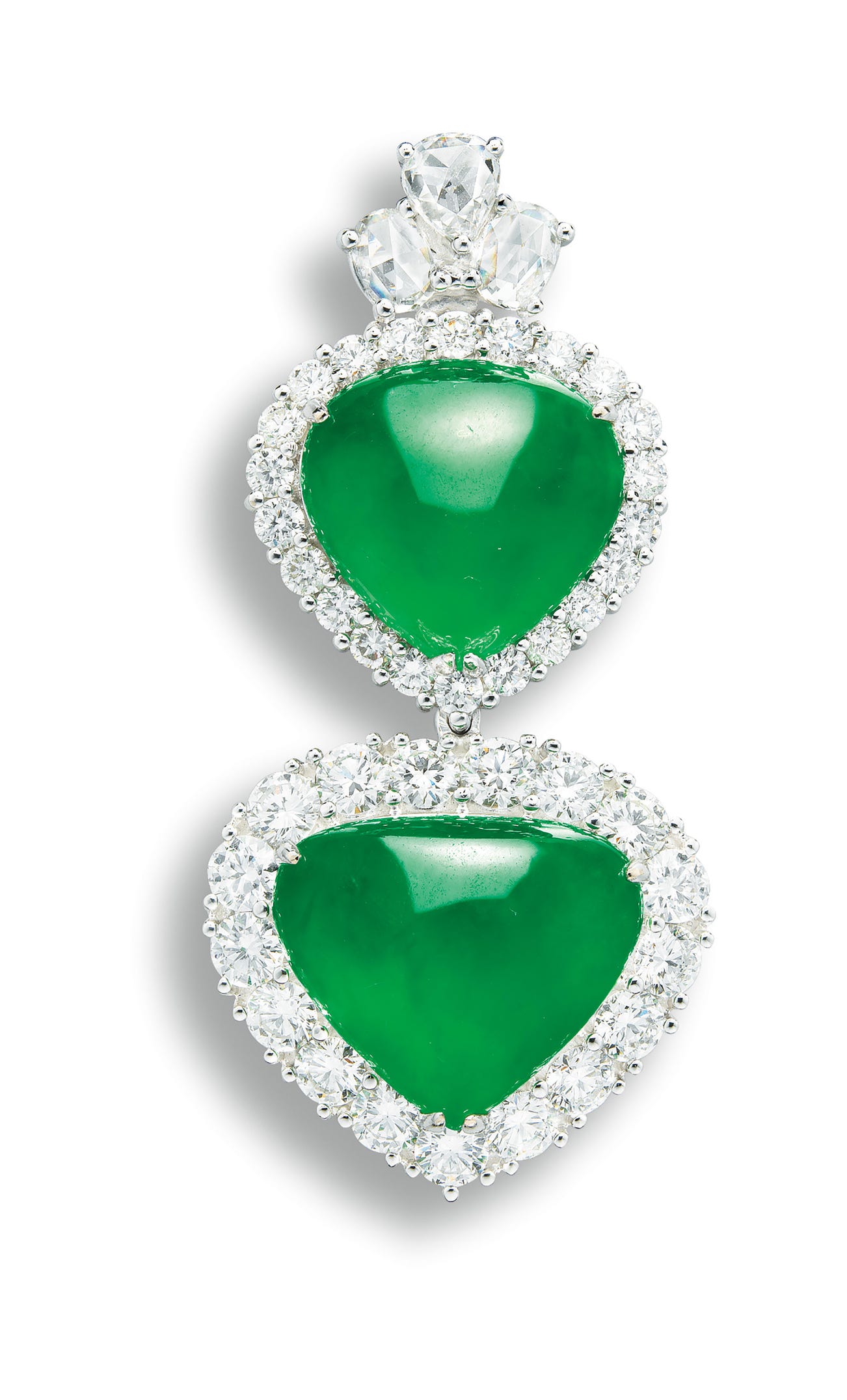Two pear-shaped jadeite cabochons, <em>measuring approximately 12.16 x 14.55 x 4.50mm and 12.66 x 12.69 x 3.80mm</em>Brilliant-cut and rose-cut diamonds, together approximately 2.80 carats18 karat white gold(Jadeite cabochons)