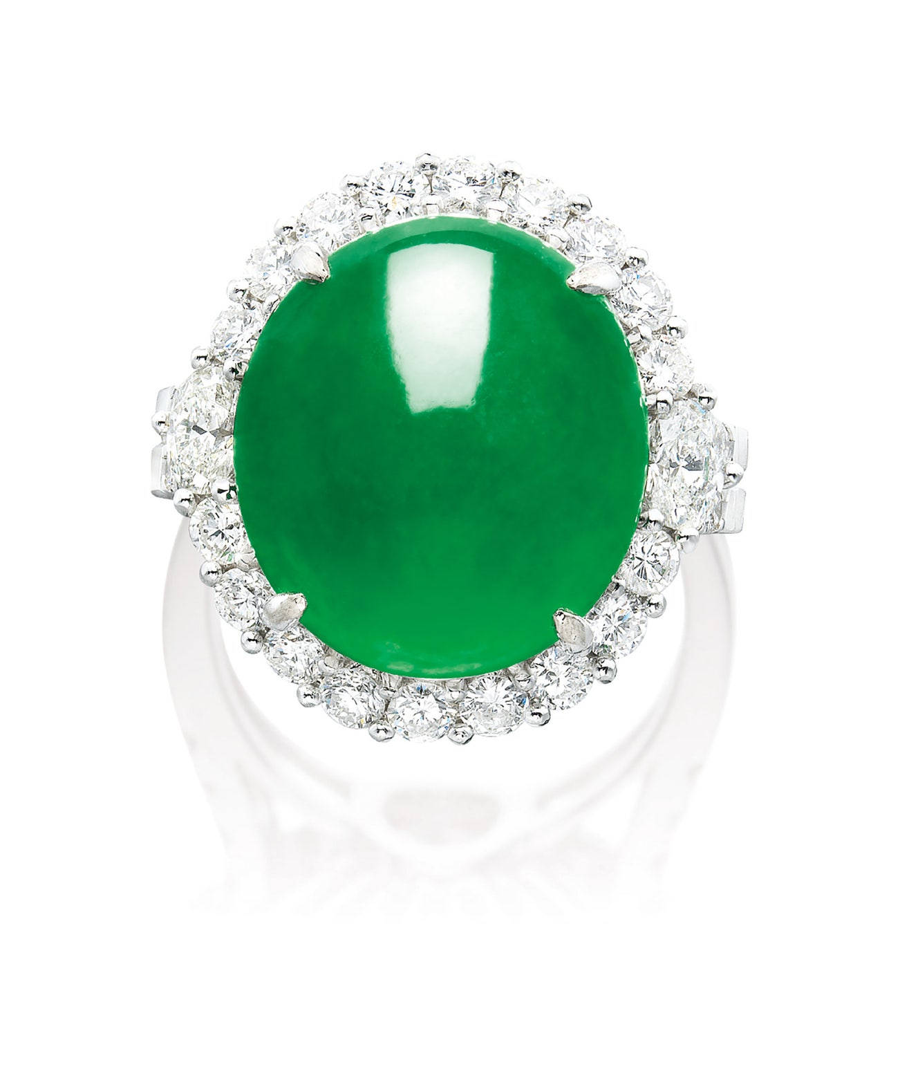 One oval jadeite cabochon, <em>measuring approximately 15.23 x 13.55 x 4.85mm</em>Brilliant-cut and oval diamonds in the surround, totalling approximately 1.20 carats18 karat white gold(Jadeite cabochon)