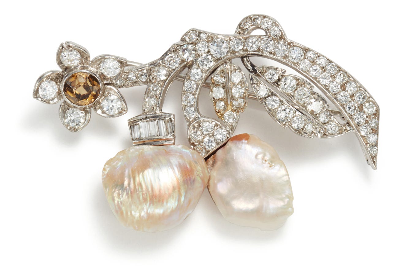 A Freshwater Cultured Pearl, Diamond, and Zircon Brooch