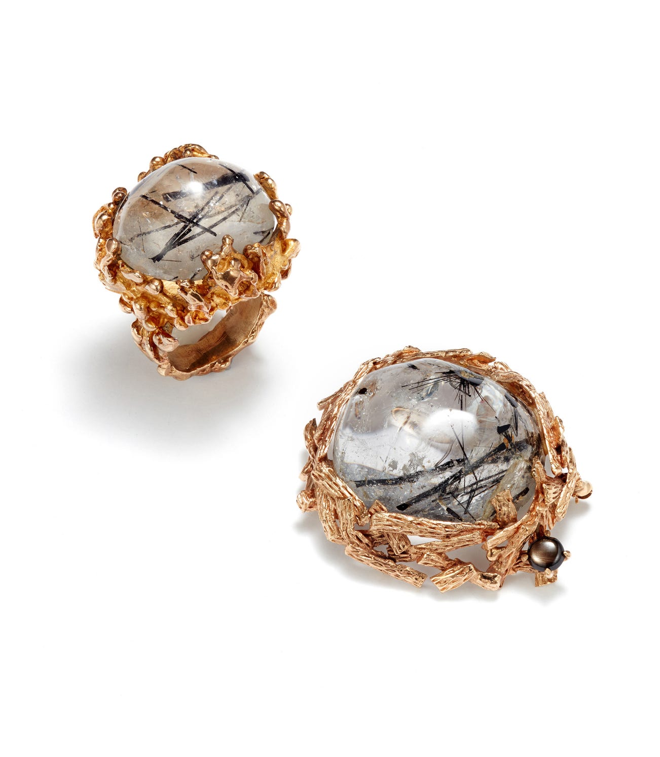 A Rutilated Quartz and Cat's Eye Sapphire Brooch and Ring