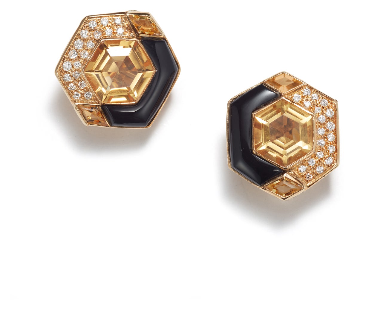 A Pair of Citrine, Onyx, and Diamond Earrings