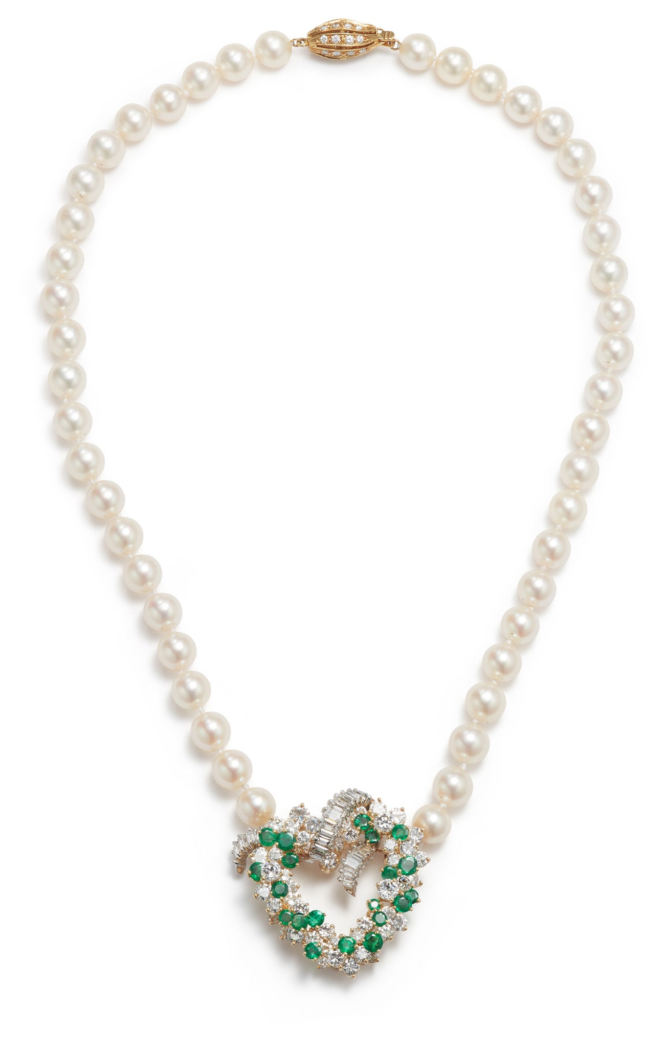 A Cultured Pearl, Diamond, and Emerald Necklace/Brooch