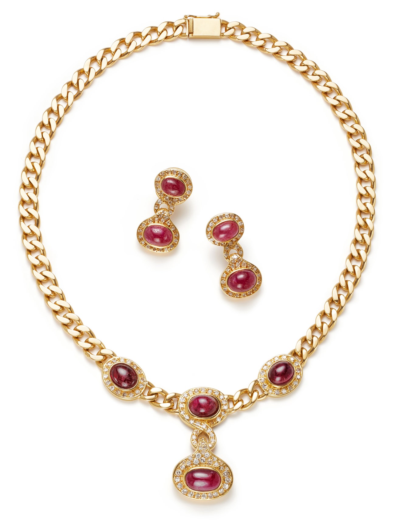 A Ruby, Diamond and Gold Necklace and Pair of Earrings
