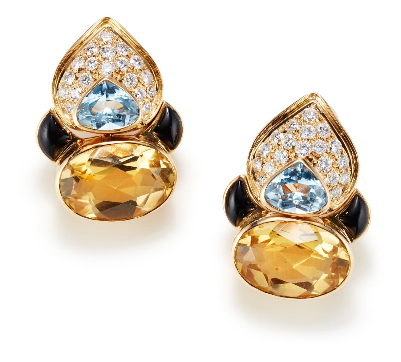 A Pair of Citrine, Topaz, Onyx, Diamond and Gold Earrings