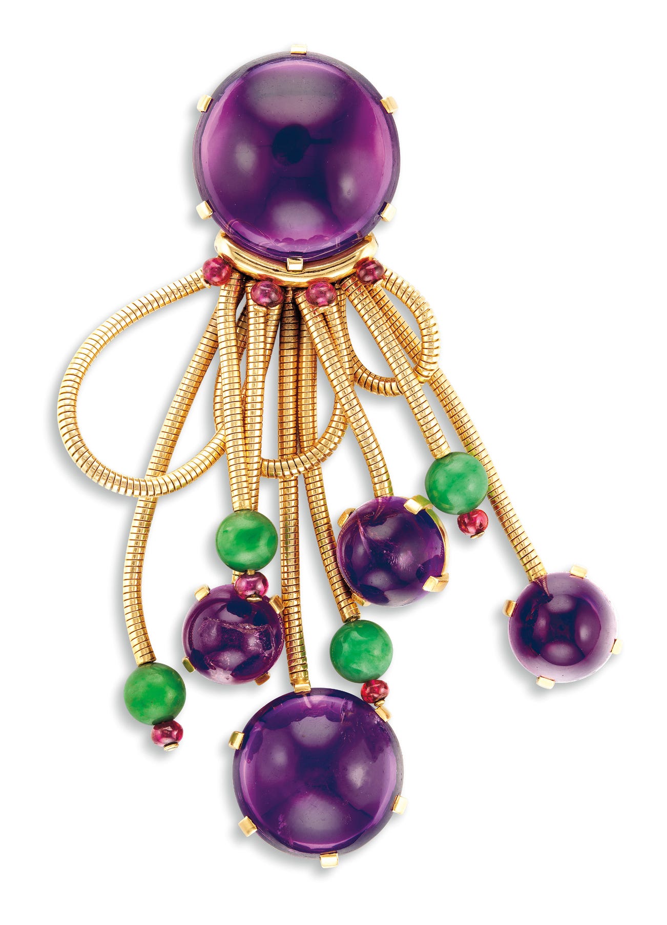 Five cabochon amethysts, totalling approximately 110.00 caratsEmbellished by jadeite and ruby beads18 karat yellow goldWith French assay marks