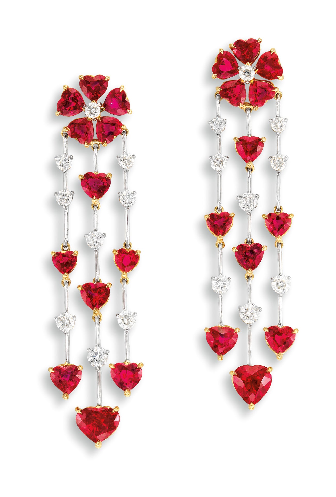 Each set with twelve heart-shaped rubies, altogether approximately 8.57 caratsSpaced by brilliant-cut diamonds, totalling approximately 1.05 carats18 karat white and yellow gold(Rubies)
