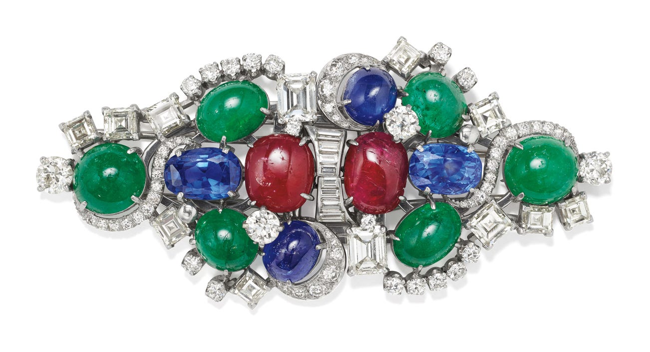 A Diamond, Emerald, Sapphire, Ruby and Platinum Brooch/Dress Clips