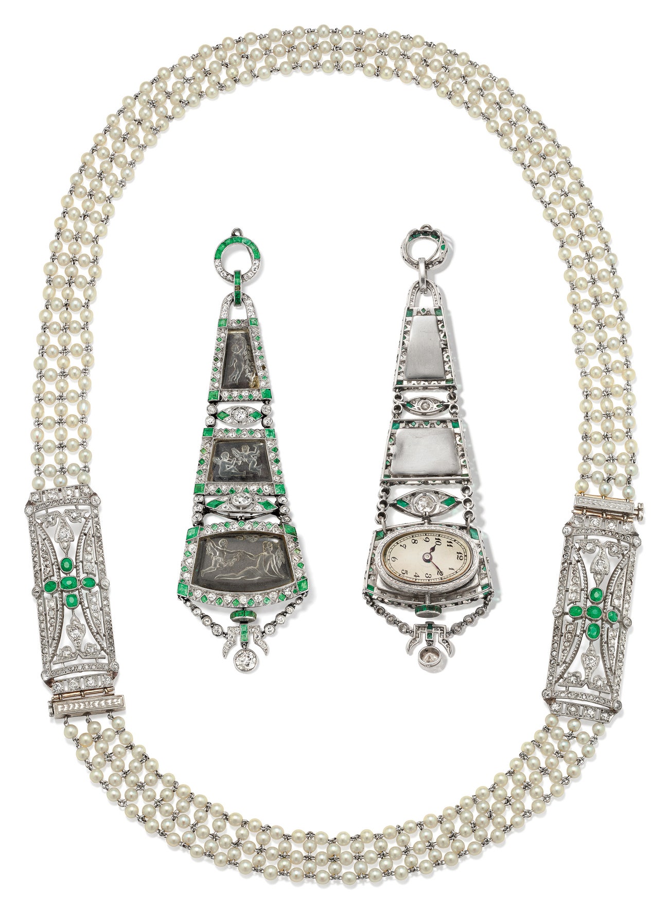 An Art Deco Diamond, Emerald, Rock Crystal and Platinum Watch Pendant and A Seed Pearl, Diamond, Emerald and Platinum Necklace
