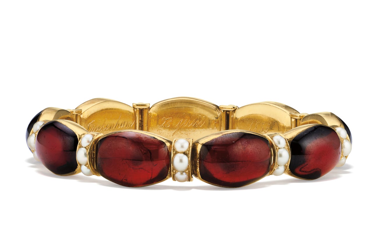 Oval-shaped garnet cabochons and seed pearls