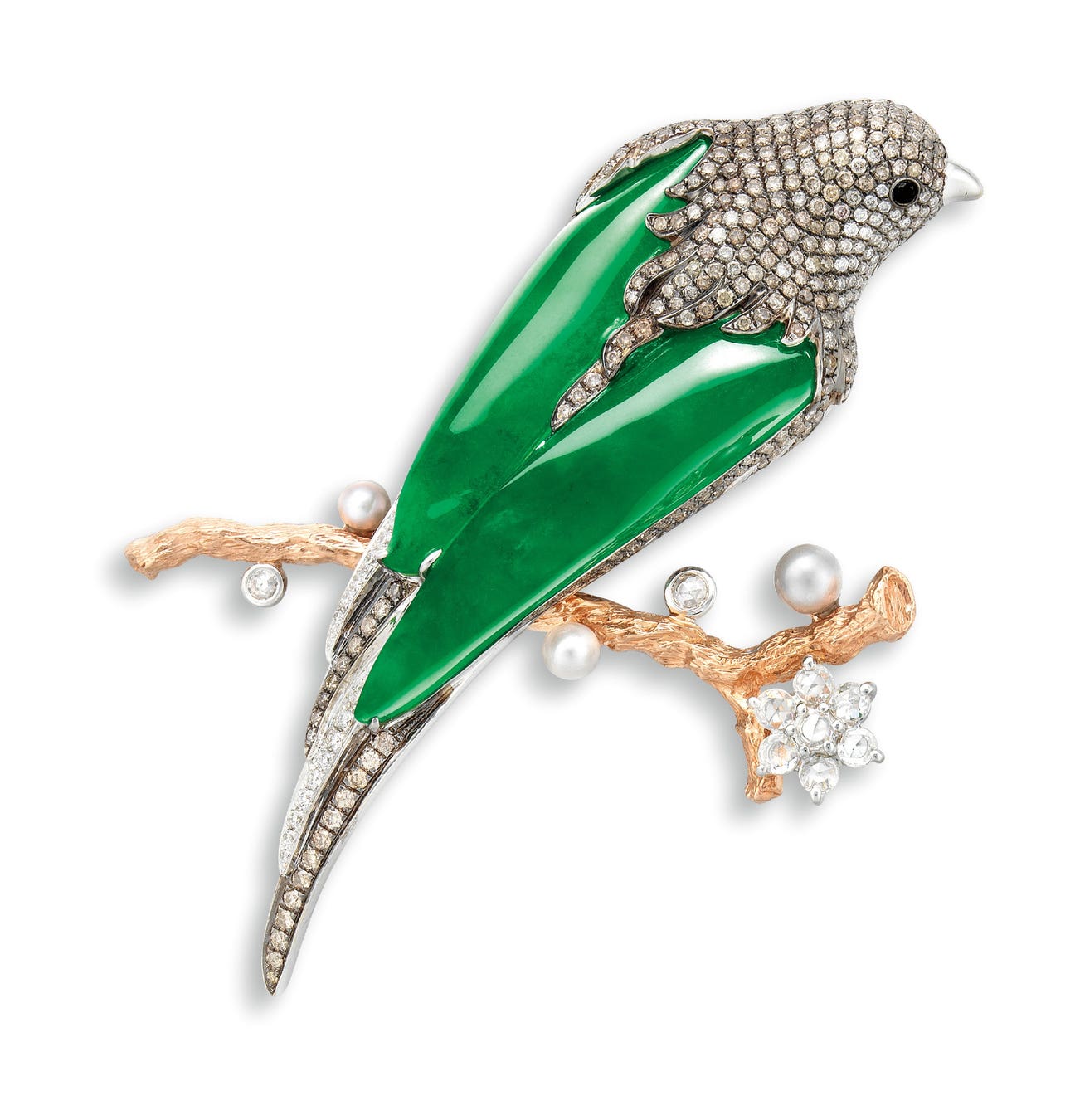 Two carved jadeite wings, <em>measuring approximately 32.93 x 8.25 x 3.95 and 29.81 x 8.53 x 2.70mm respectively </em>Coloured diamonds and diamonds set throughout the body, with black diamond eye, together approximately 1.55 caratsRose-cut diamond blossoms accented with three seed pearls18 karat pink and white gold(Carved Jadeites)
