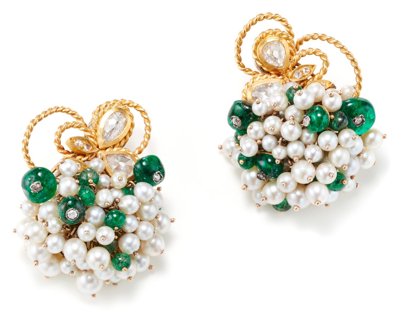 A Pair of Cultured Pearl, Emerald, Diamond and Gold Earrings