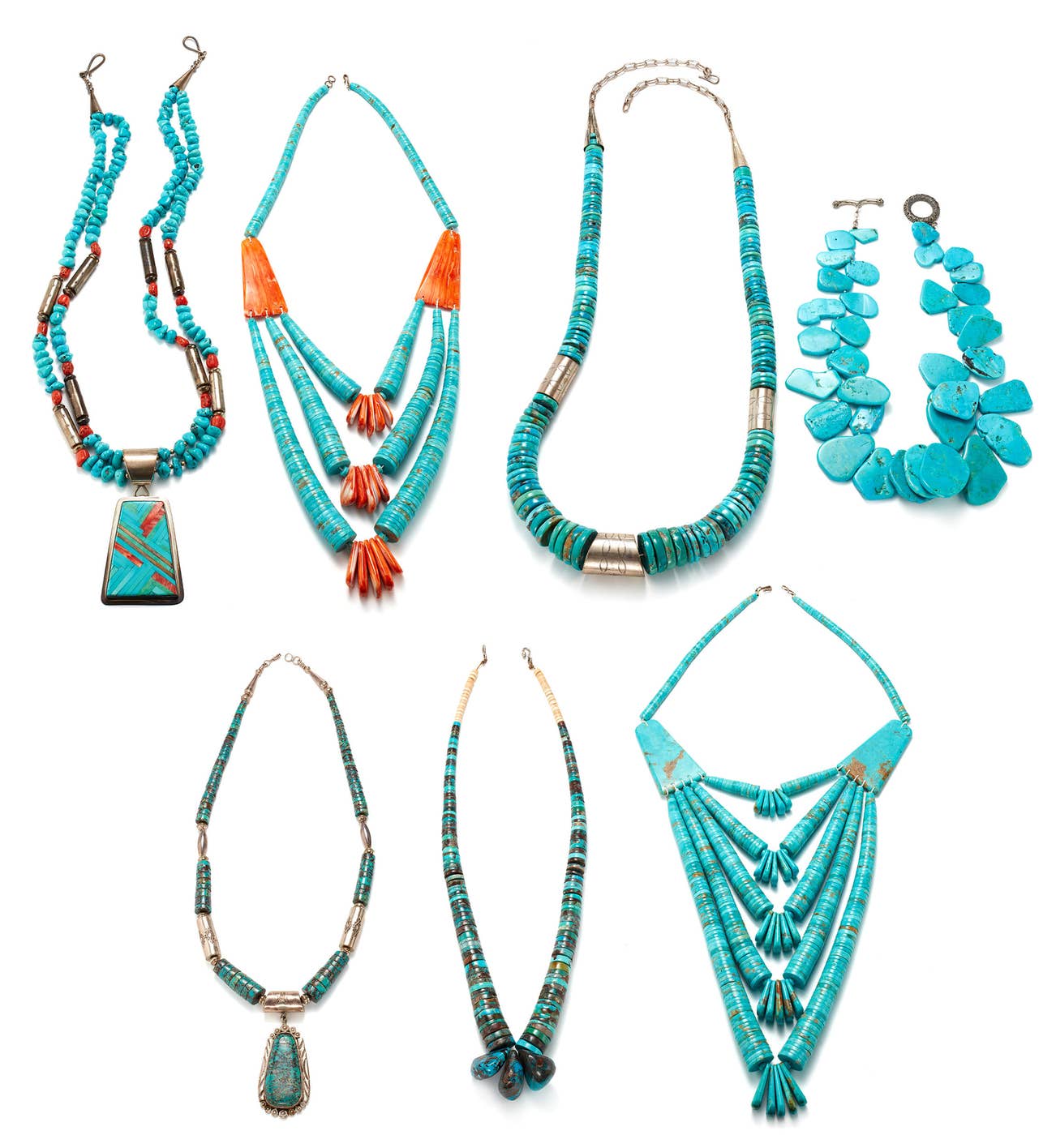 A Collection of Turquoise, Coral, Shell and Silver Necklaces